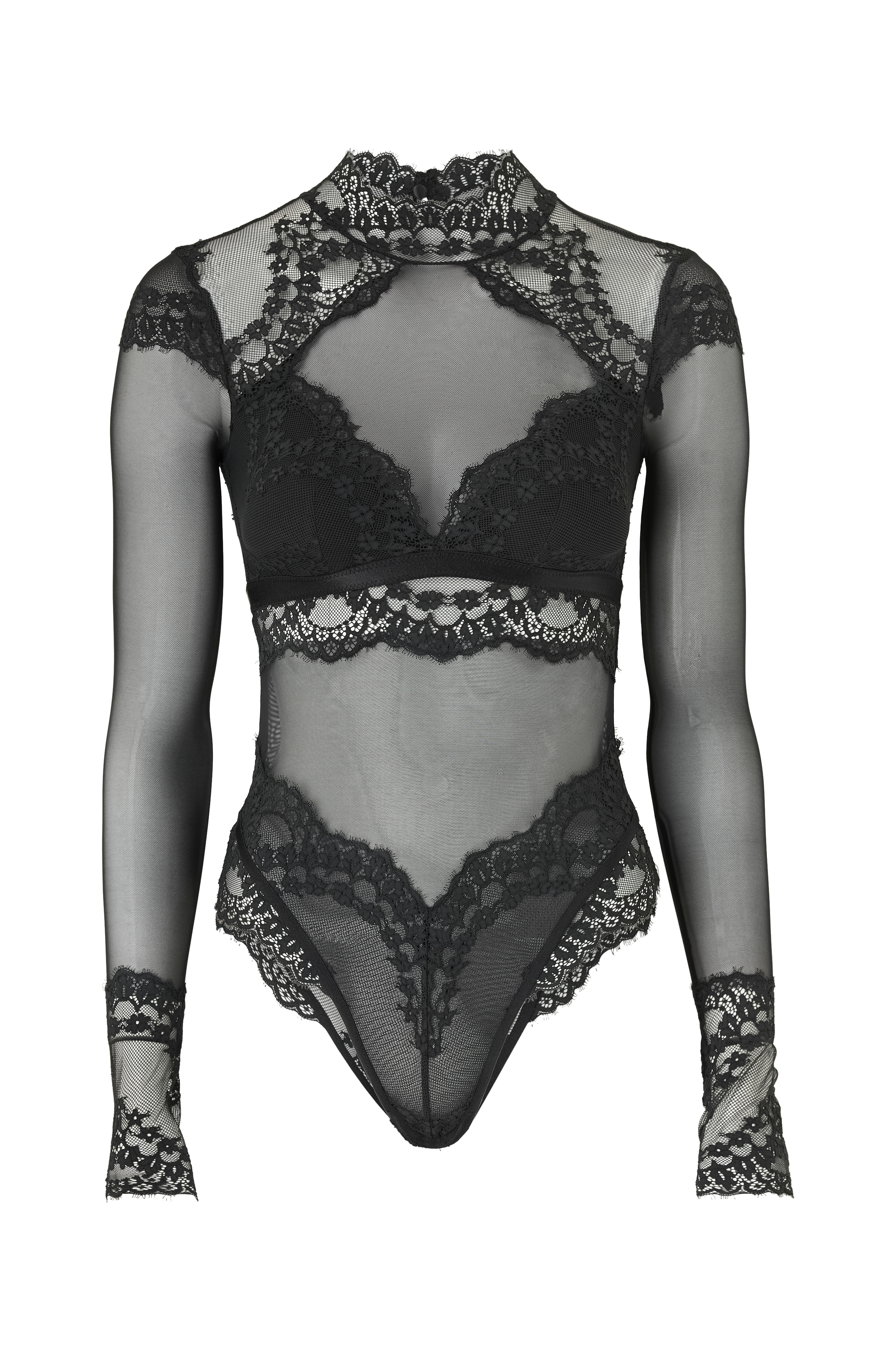 • Långärmad body i mesh och spets• Hög krage• Knappstängning i nacken• Hysk- och hakstängning i ryggen• Uttagbar vaddering i kuporna• Tumhål i ärmsluten• Tryckknappar i grenen