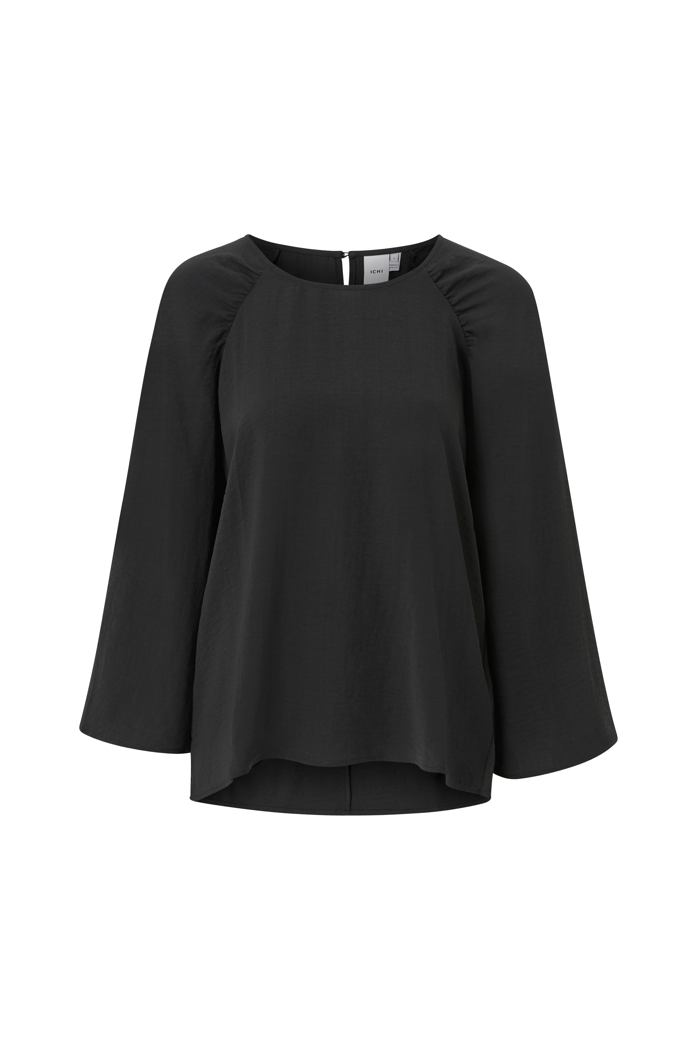 Blus ihBirdie LS från ICHI. Rak oversizemodell med extra vid, raglanskuren ärm som har rynk på axelsömmarna både fram och bak. Rund hals med smal fåll och sprund med knapp i nacken.
