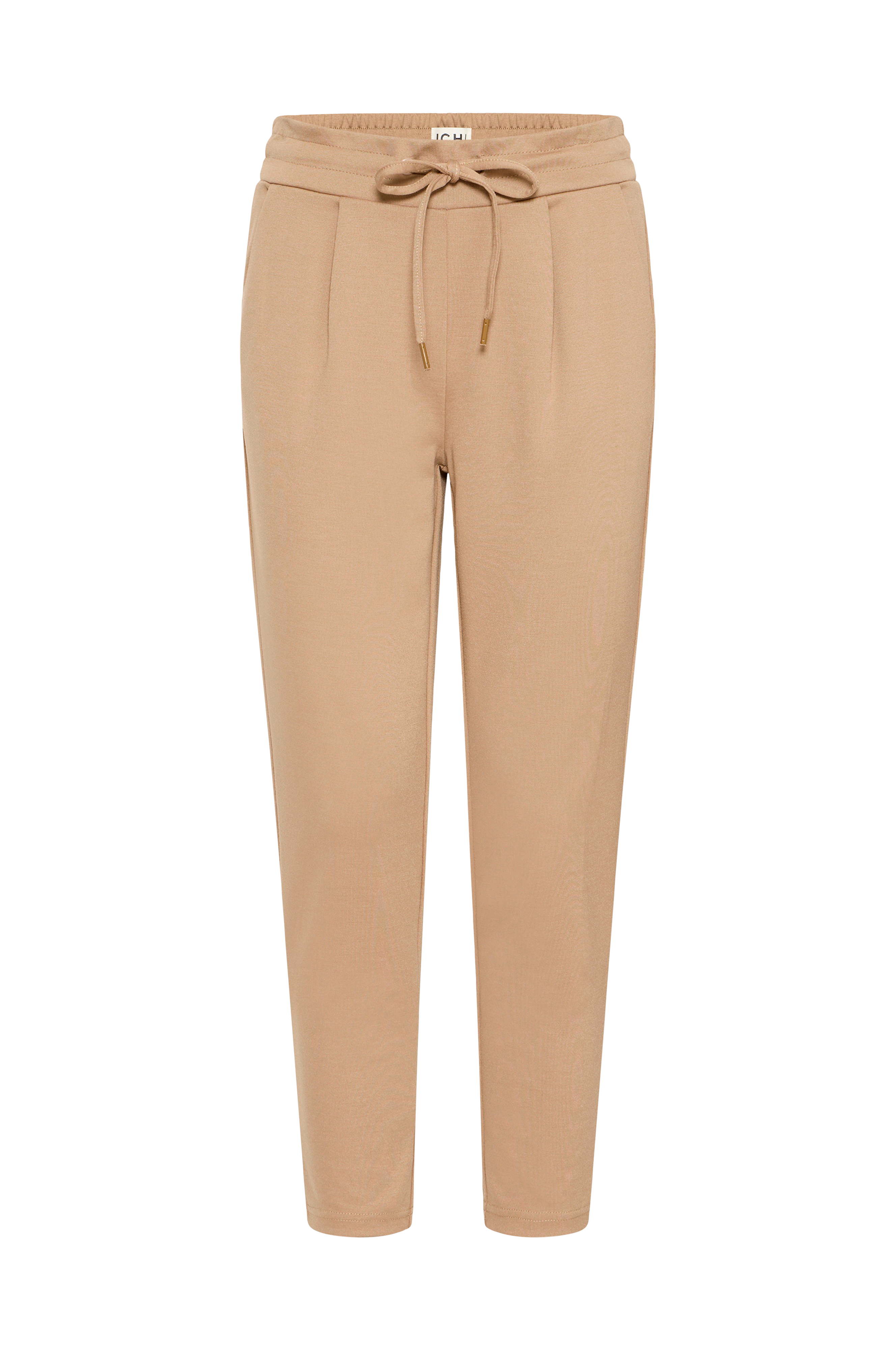 Byxor Kate från ICHI i avsmalnande modell med något kortare ben, fickor i sidorna och fuskfickor bak. Stum midja fram och resår bak samt justerbar dragsko och lagda veck fram. Gjorda i mjuk trikå. Beninnerlängd ca 64 cm i stl S.