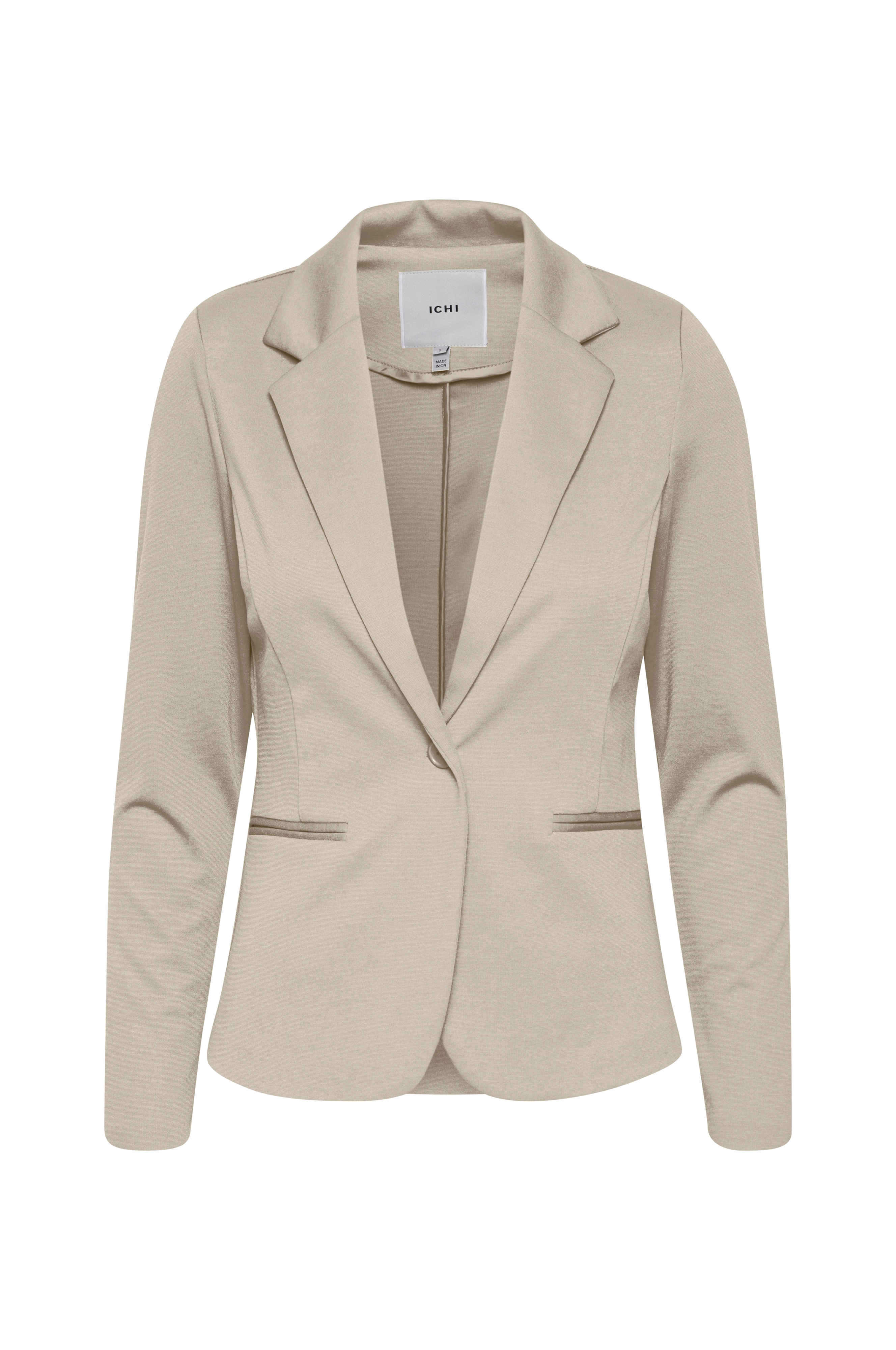Kavaj Kate från ICHI i klassisk, lätt figursydd modell med enkelknäppning och passpoalfickor fram. Gjord i behaglig trikå. Ofodrad. Längd ca 62 cm i stl S.