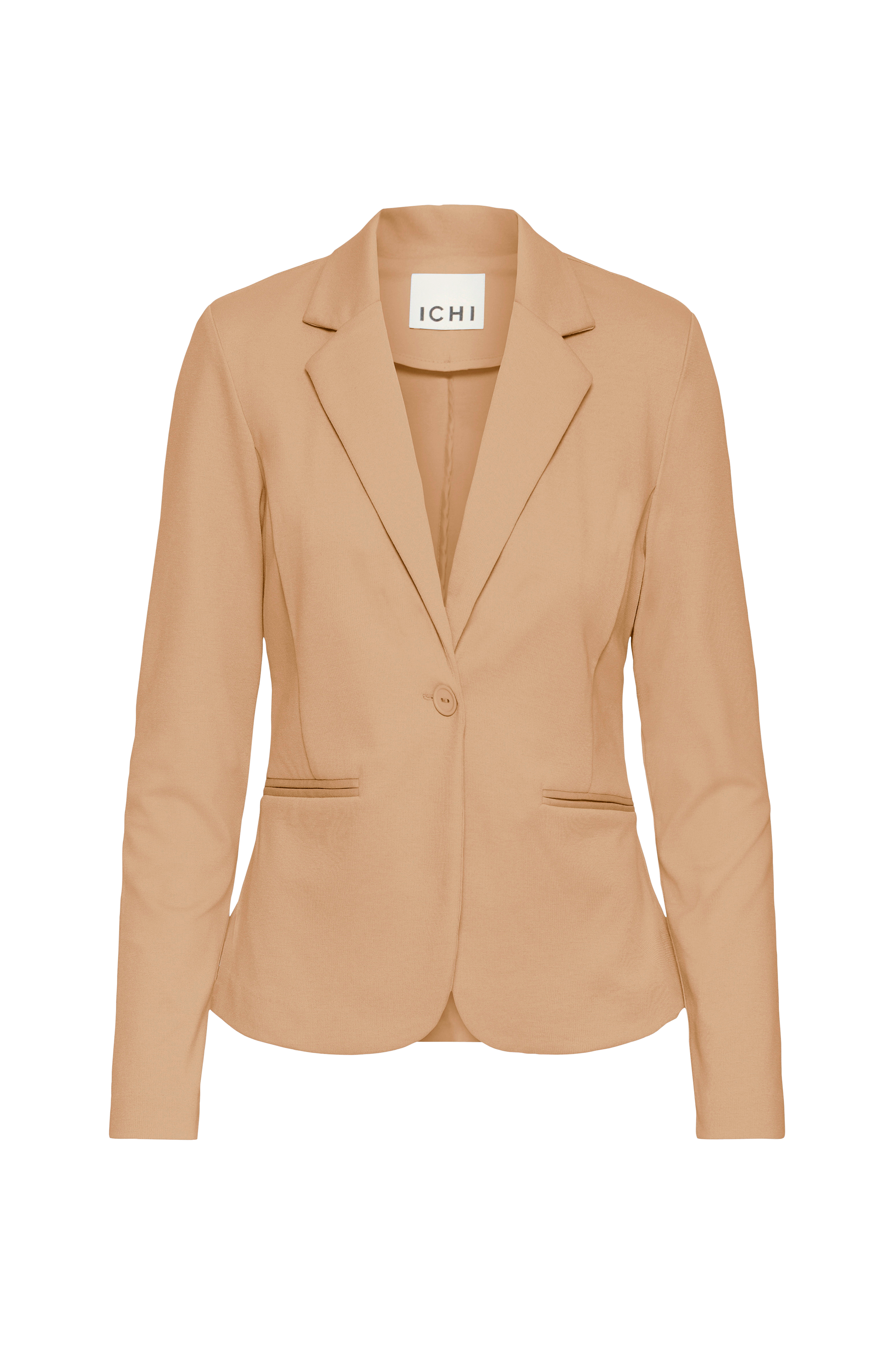 Kavaj Kate från ICHI i klassisk, lätt figursydd modell med enkelknäppning och passpoalfickor fram. Gjord i behaglig trikå. Ofodrad. Längd ca 62 cm i stl S.