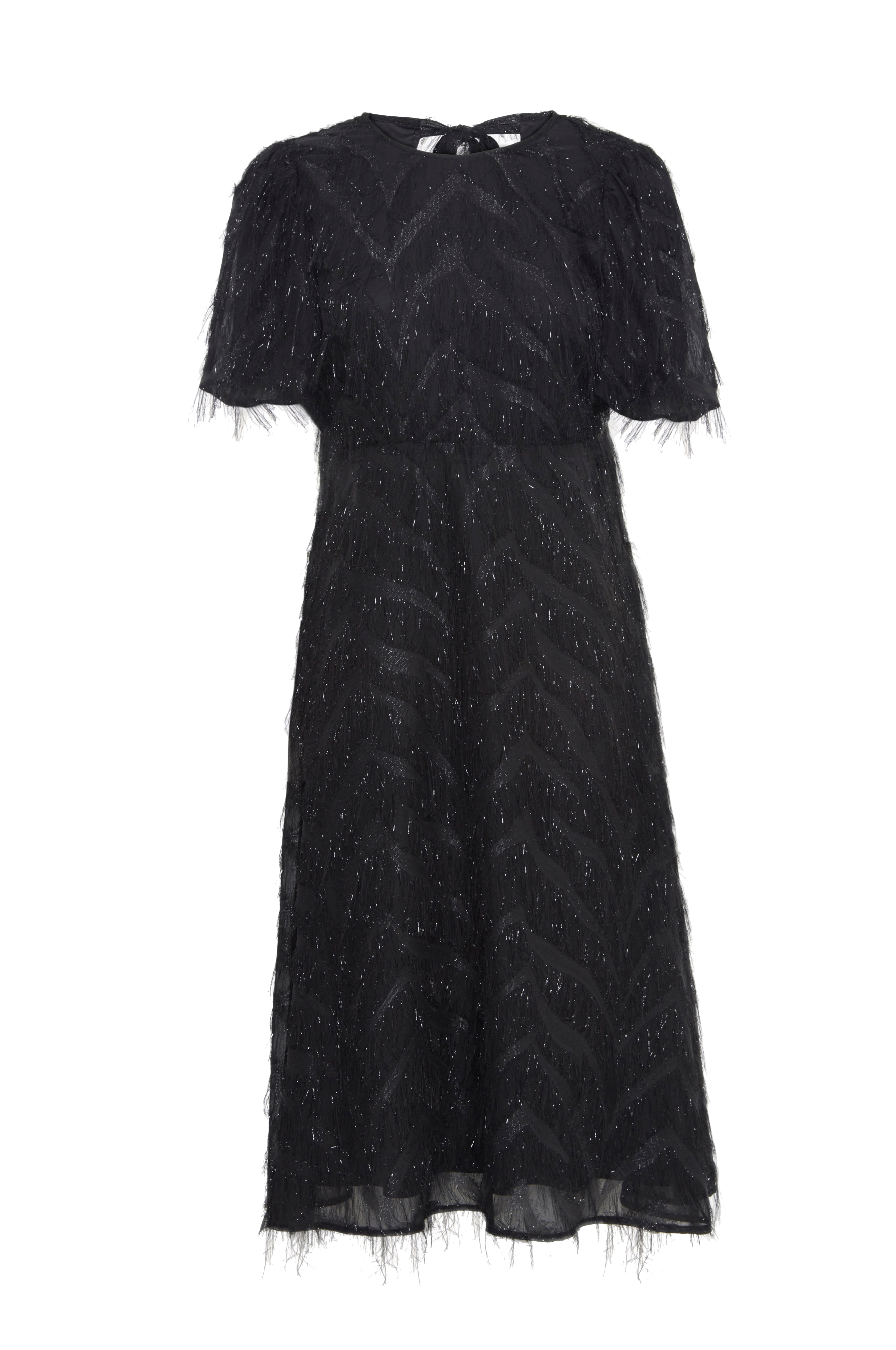 • Figurformad modell i chiffong med tunna, glittriga fransar över hela• Rund hals med långt knytband i nacken och öppen rygg• Kort ballongärm• Markerad midja med vidd i kjolen• Fodrad• Längd: 118 cm i storlek 36