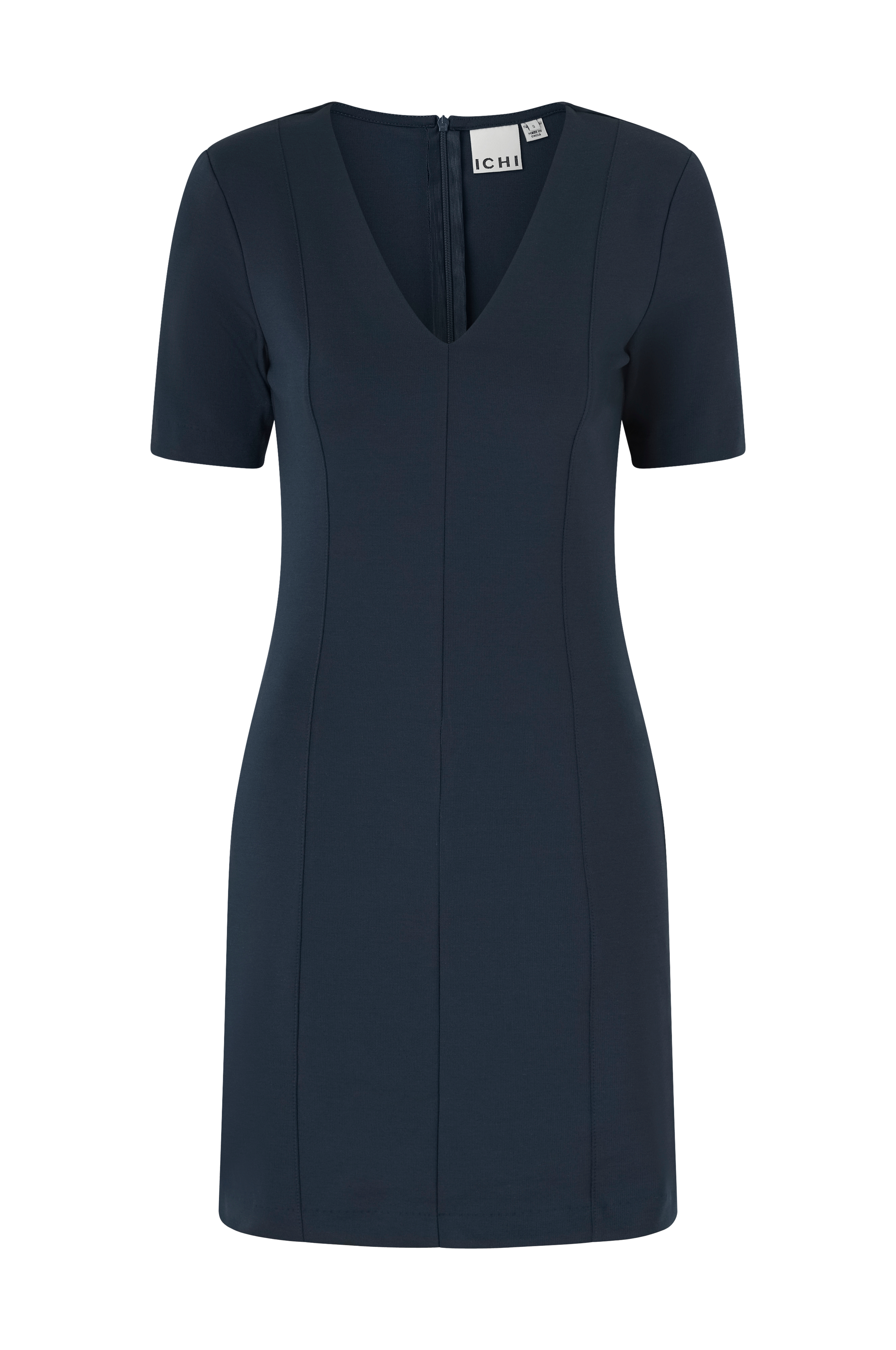 • Klänning i mjuk polyestermix med sömdetaljer fram och bak• V-formad halsringning• Korta ärmar• Dragkedja i ryggen• Midilängd• Figurnära passform med utsvängd nederdel• Längd: 87 cm i storlek S