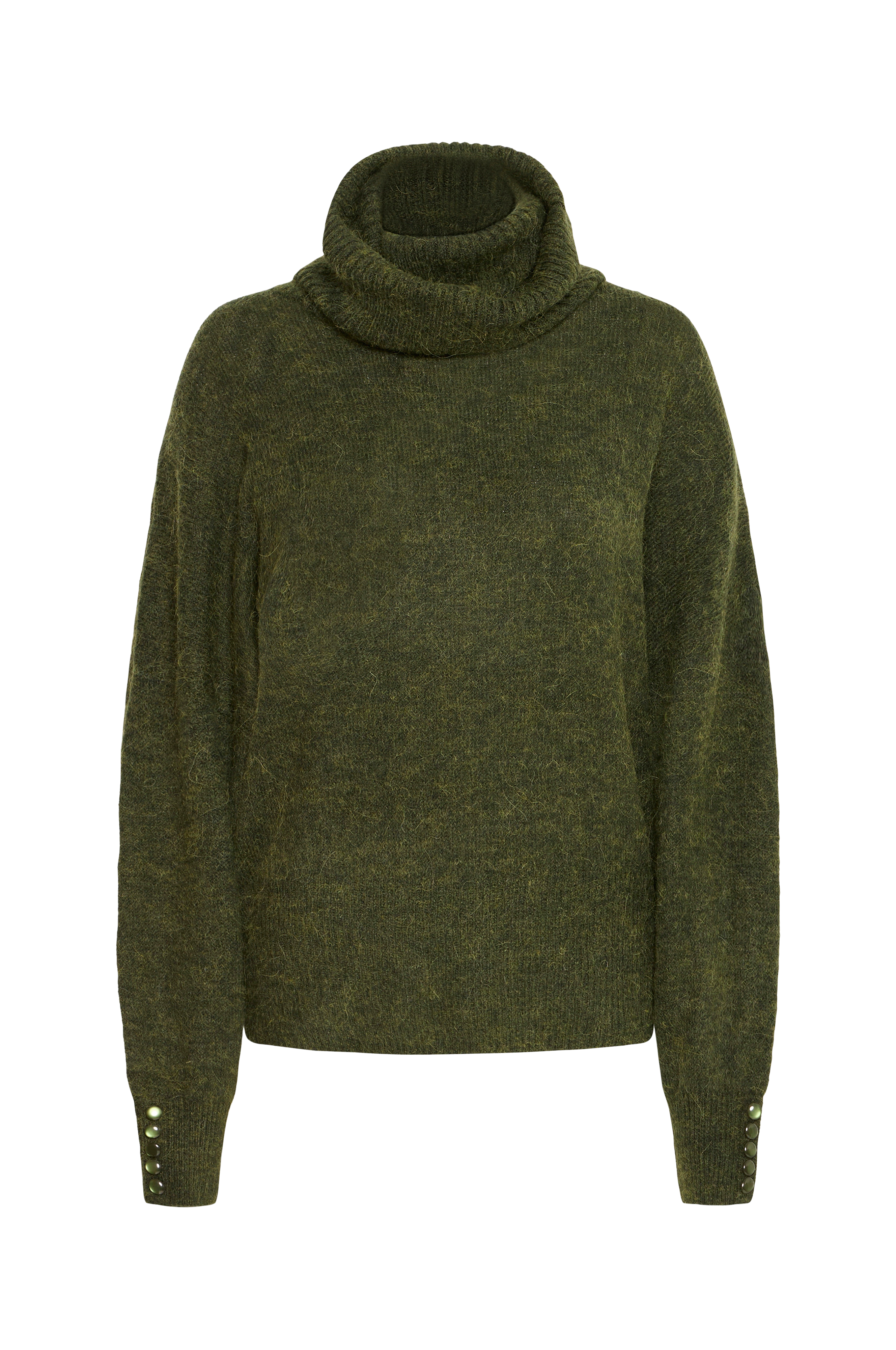 • Vid, slätstickad modell• Hög, ribbstickad krage• Nerhasad axel• Lång ärm med ribbstickning och dekorknappar i ärmsluten• Bred ribbstickning nedtill