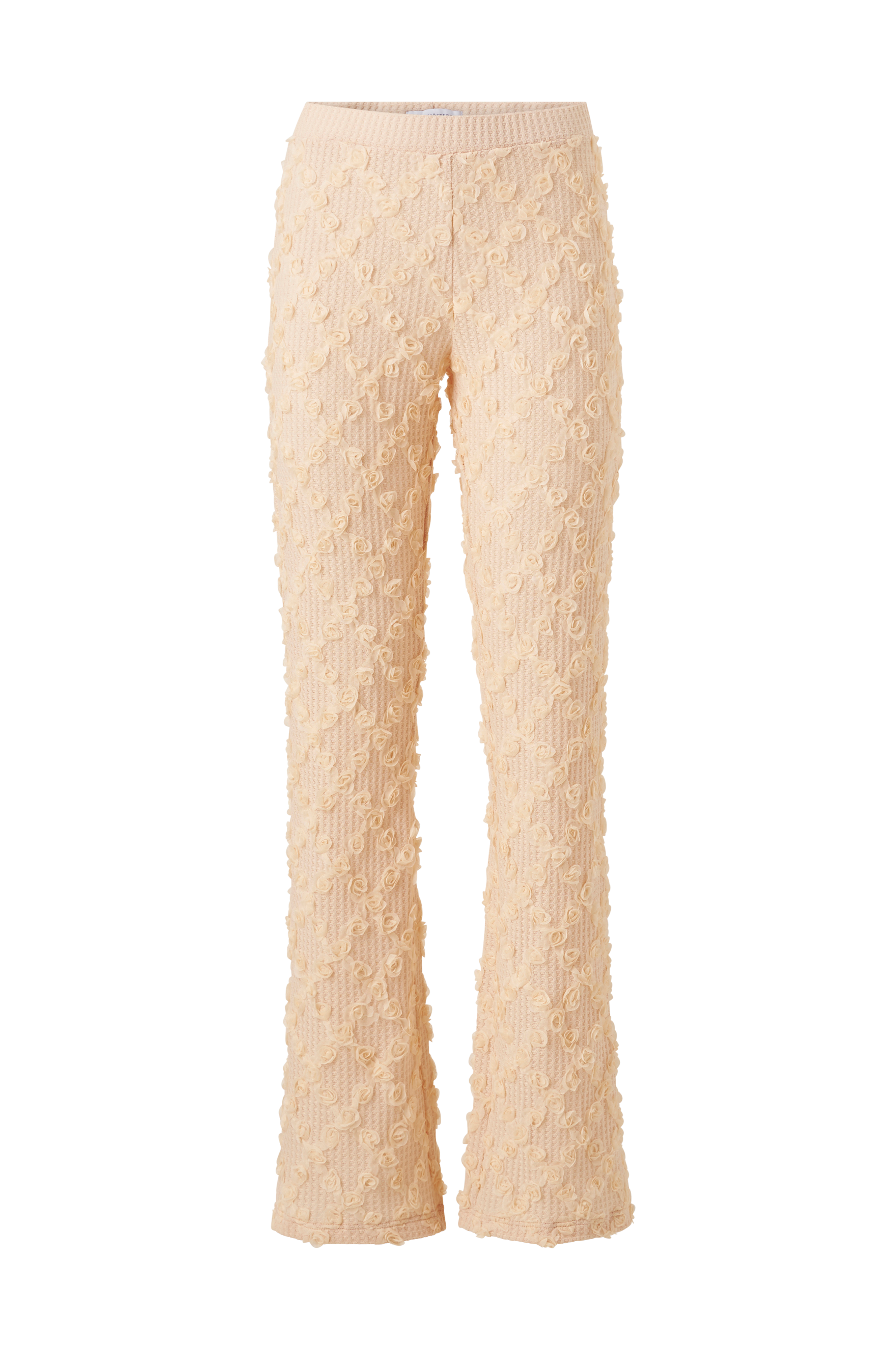 • Stretchiga byxor med påsydda blommor i textil• Elastisk midja• Något utsvängda ben