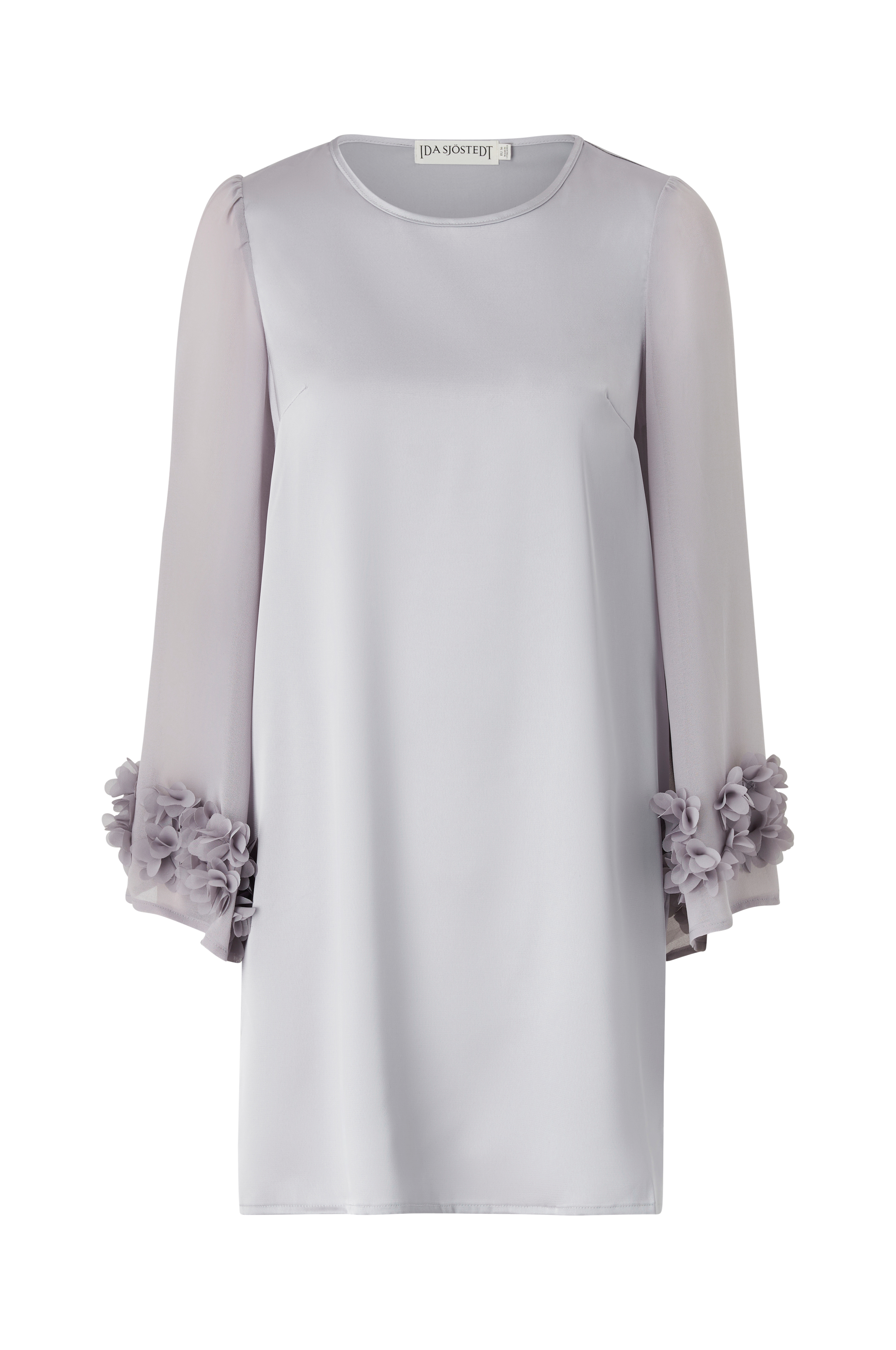 • Stilren klänning i satin• Vida, transparenta ärmar i chiffong med 3D-blommor i ärmsluten• Längd: 87 cm i storlek 36