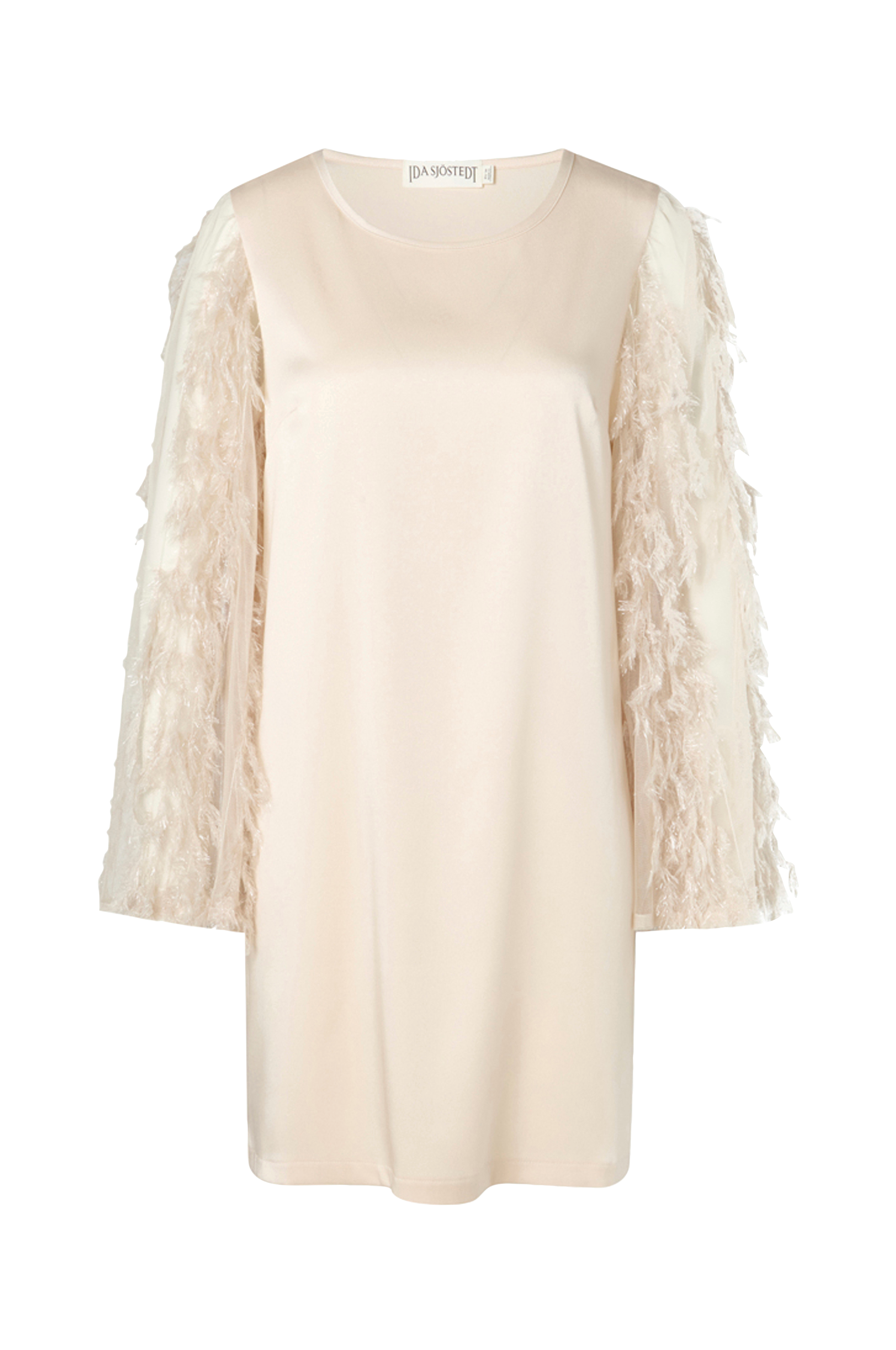 • Trumpetärmar i transparent mesh med fjäderliknande, glittriga dekorationer