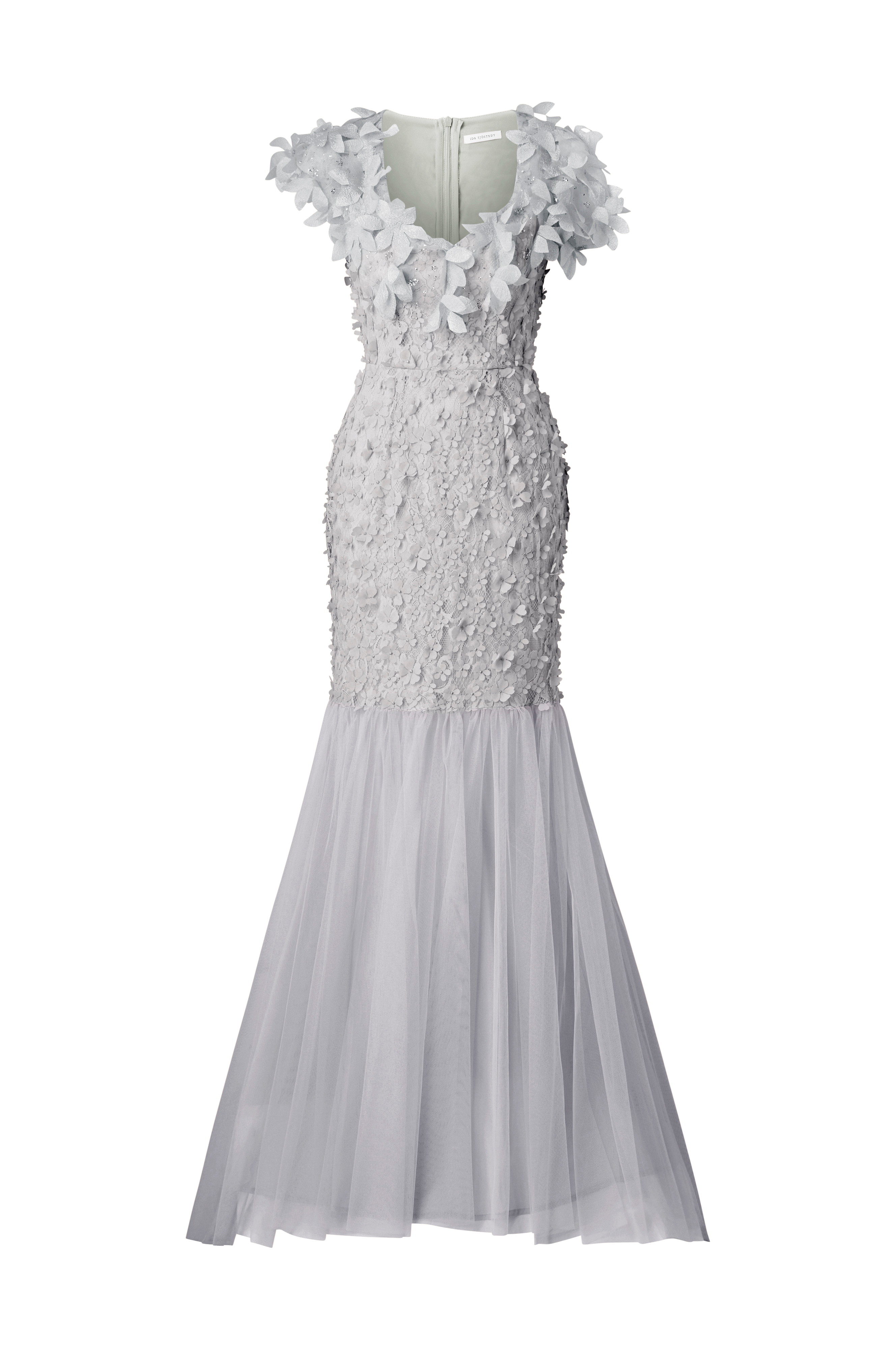 Lång, elegant festklänning med spets och tyll samt dekorativa tygblommor och tyglöv. Figurnära passform med utsvängd nederdel. V-ringning och dold dragkedja i ryggen. Längd 155 cm i stl 36.