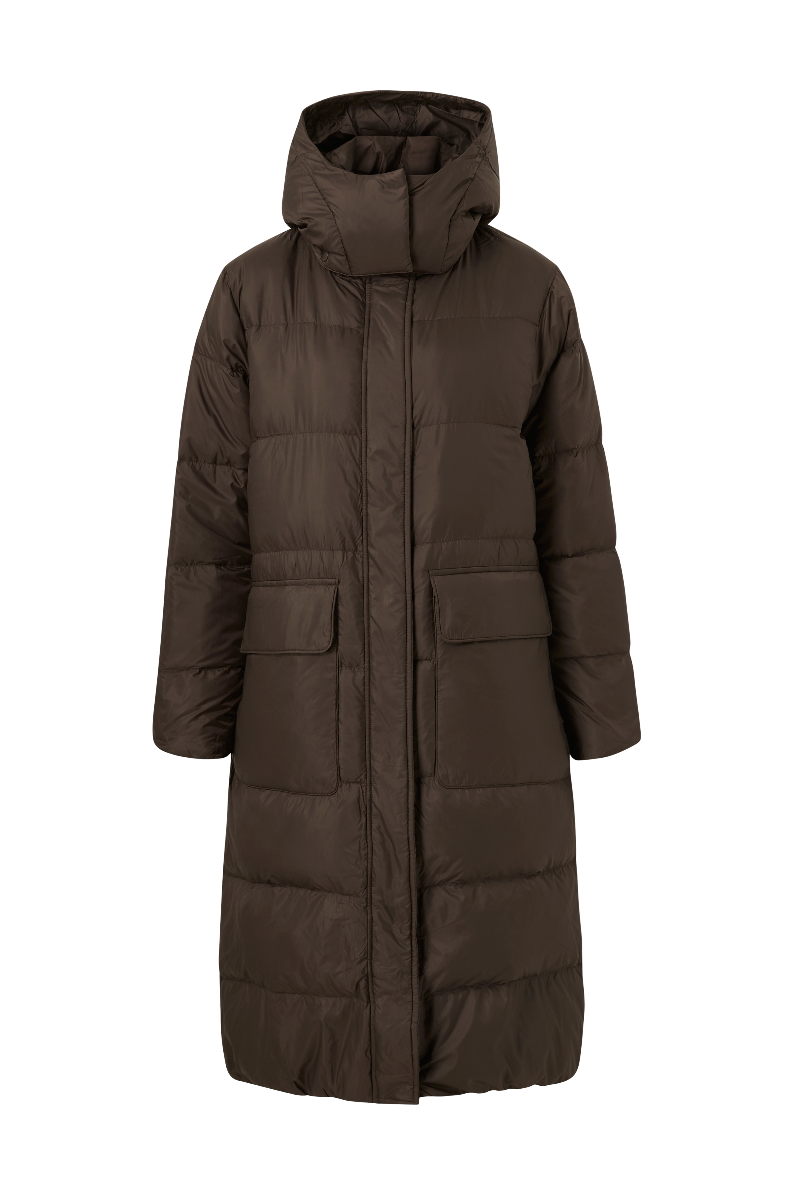 • Lång dunkappa med avtagbar huva • Hög krage • Tvåvägsdragkedja • Vindslå över dragkedjan med tryckknappar • Resår i ärmsluten • Invändig dragsko i midjan • Två ytterfickor med tryckknappsstängning • Längd: 108 cm i storlek 36