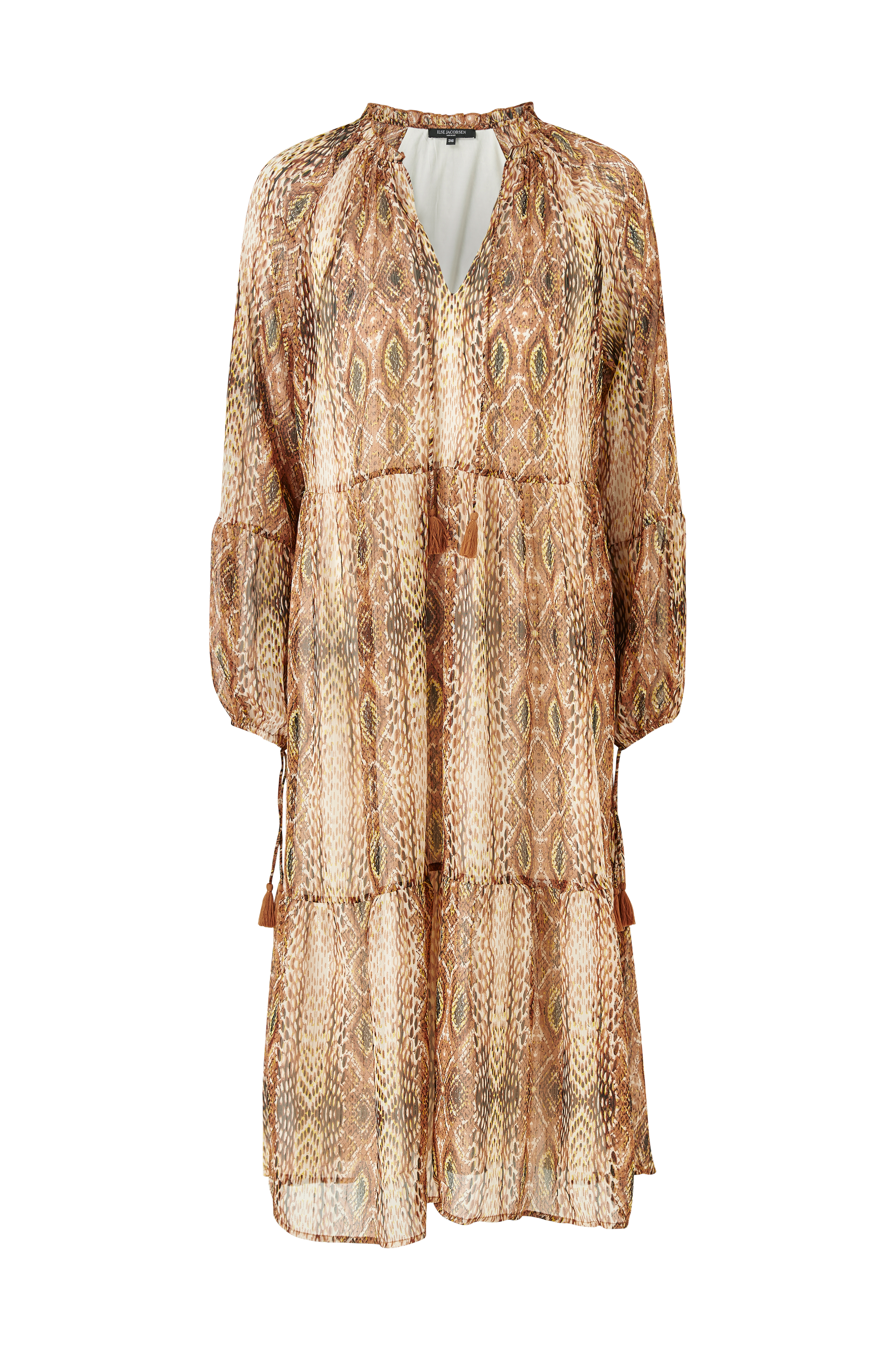 Klänning Crin7005SNA från Ilse Jacobsen i skir, vävd kvalitet med fint fall. Lätt utställd, halvtransparent modell med tryckt mönster och smala, glittriga ränder. V-ringad hals med liten volangkant. Resår i ärmsluten. Två knytband med tofsar i halsringningen och i ärmsluten. Längd ca 119 cm i stl S.