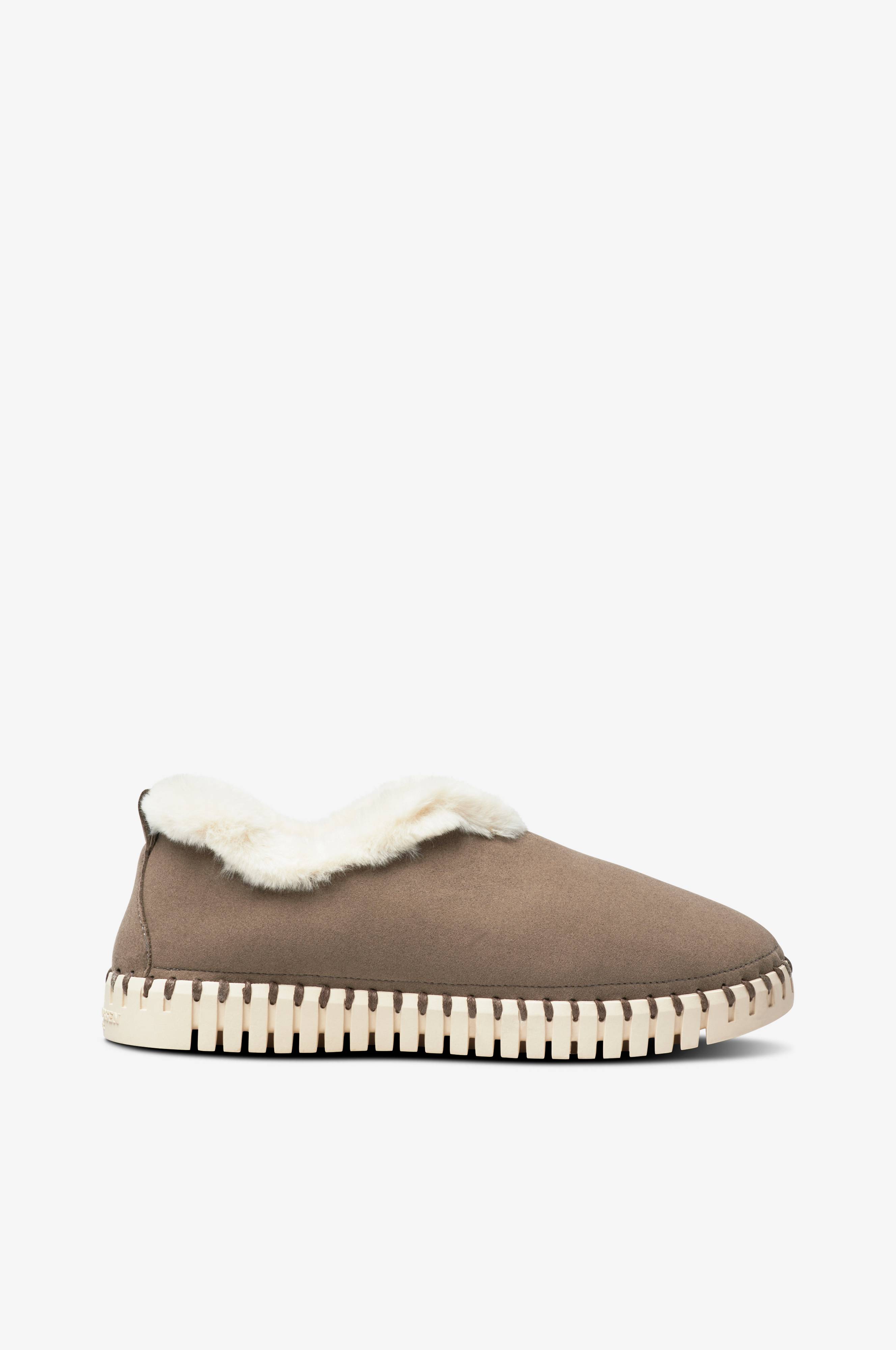 Låga skor i mjuk microfiber med mockakänsla. Fodrade i fuskpäls. Flexibel yttersula av naturgummi med ribbad design. Använd som innetofflor eller uteskor.