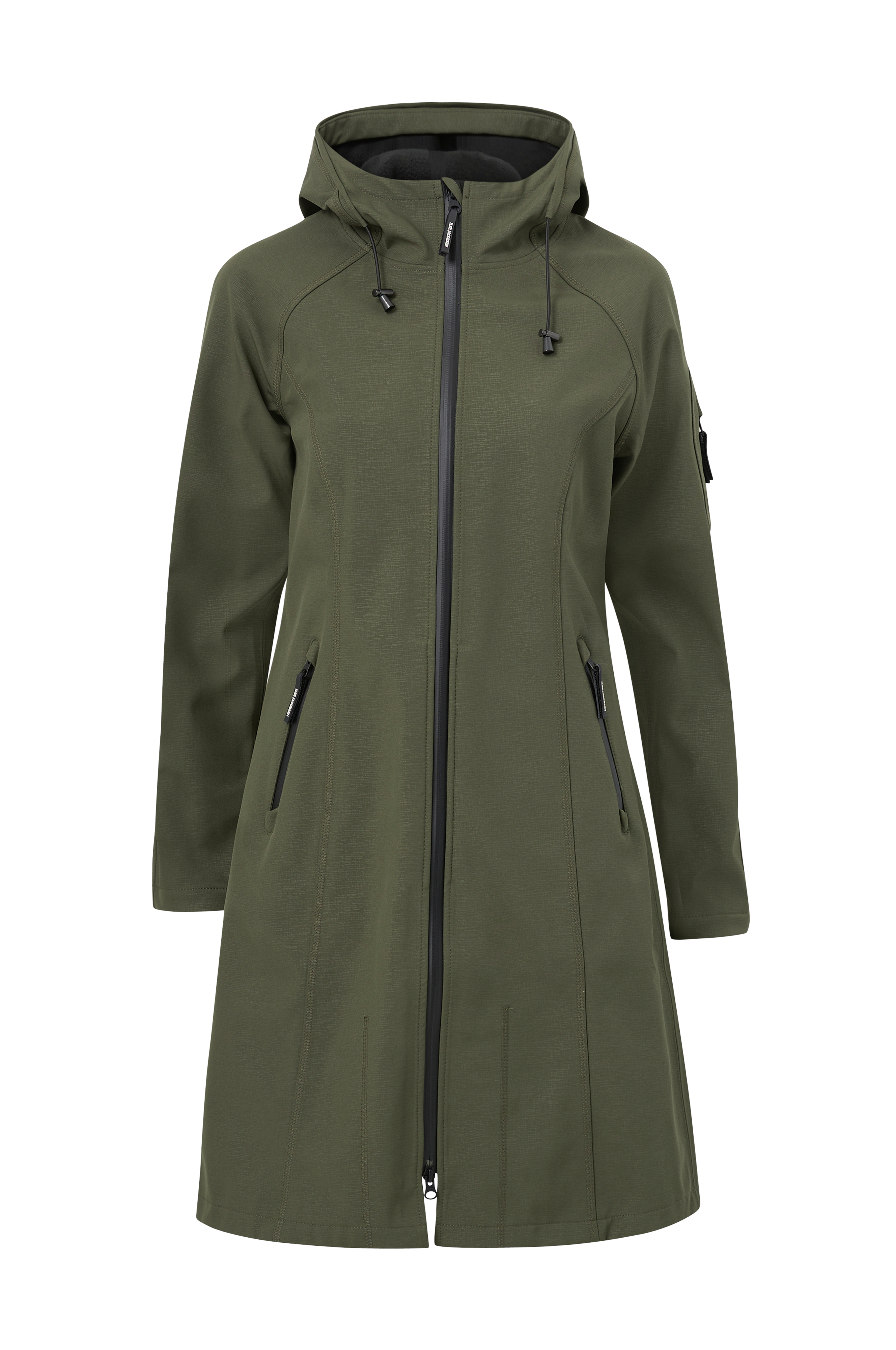 Softshell regnkappa i kvalitet som andas och med tejpade sömmar. Vattenpelare 5000 mm. Figursydd modell med tvåvägs, vattentät dragkedja och hög krage. Huva med skärm och elastisk dragsko med stoppers. Två infällda fickor med vattentäta dragkedjor och en liten ficka med dragkedja på ena ärmen. Sprund med tryckknapp nertill bak. Mjuk insida i fleece. Längd ca 98 cm i stl 36.