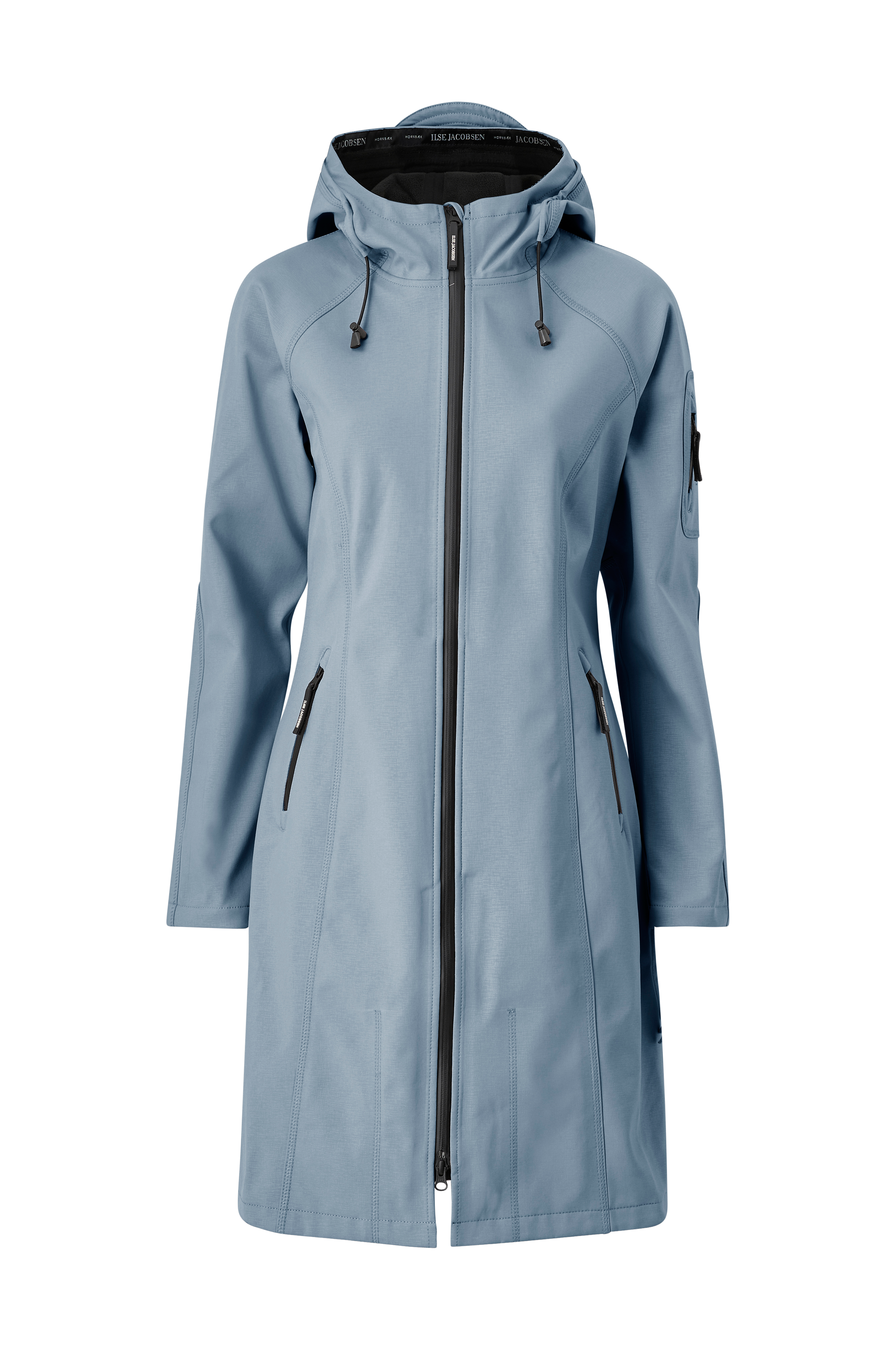 Softshell regnkappa i kvalitet som andas och med tejpade sömmar. Vattenpelare 5000 mm. Figursydd modell med tvåvägs, vattentät dragkedja och hög krage. Huva med skärm och elastisk dragsko med stoppers. Två infällda fickor med vattentäta dragkedjor och en liten ficka med dragkedja på ena ärmen. Sprund med tryckknapp nertill bak. Mjuk insida i fleece. Längd ca 98 cm i stl 36.