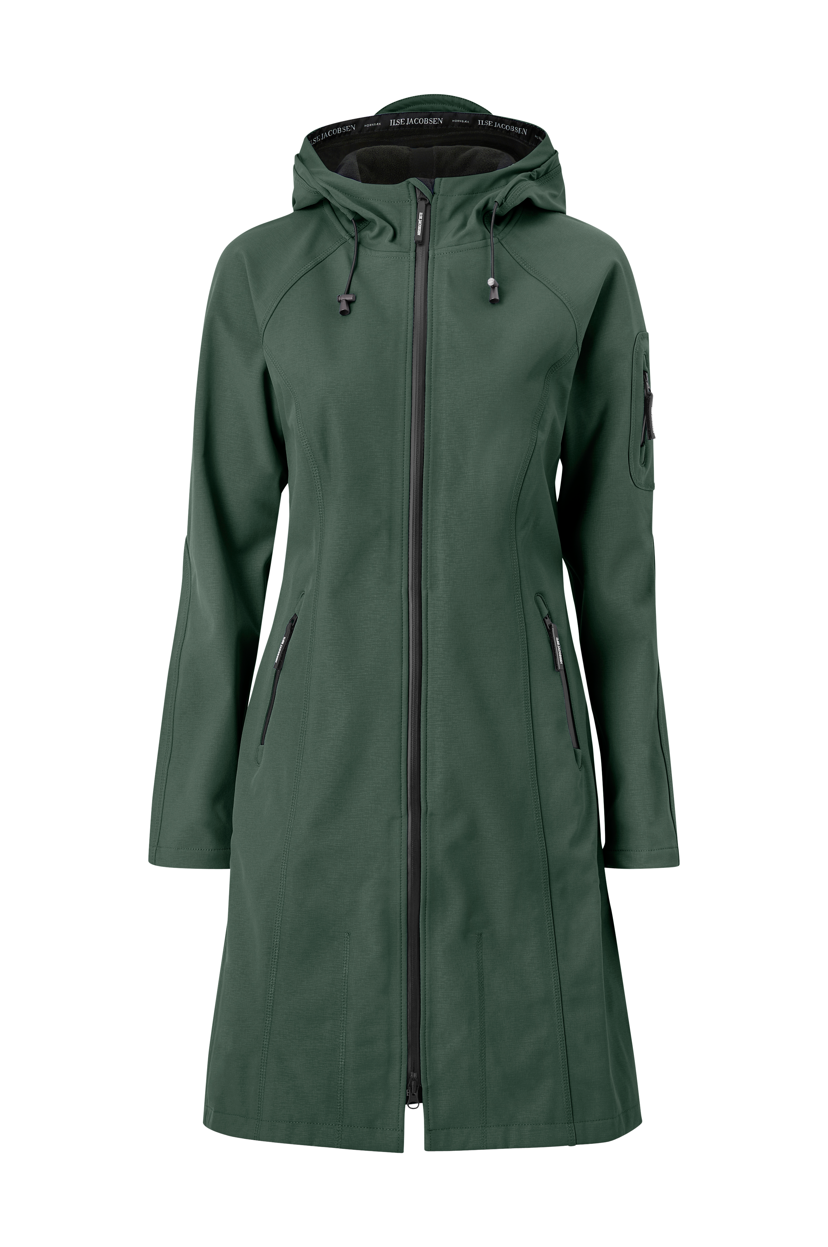 Softshell regnkappa i kvalitet som andas och med tejpade sömmar. Vattenpelare 5000 mm. Figursydd modell med tvåvägs, vattentät dragkedja och hög krage. Huva med skärm och elastisk dragsko med stoppers. Två infällda fickor med vattentäta dragkedjor och en liten ficka med dragkedja på ena ärmen. Sprund med tryckknapp nertill bak. Mjuk insida i fleece. Längd ca 98 cm i stl 36.
