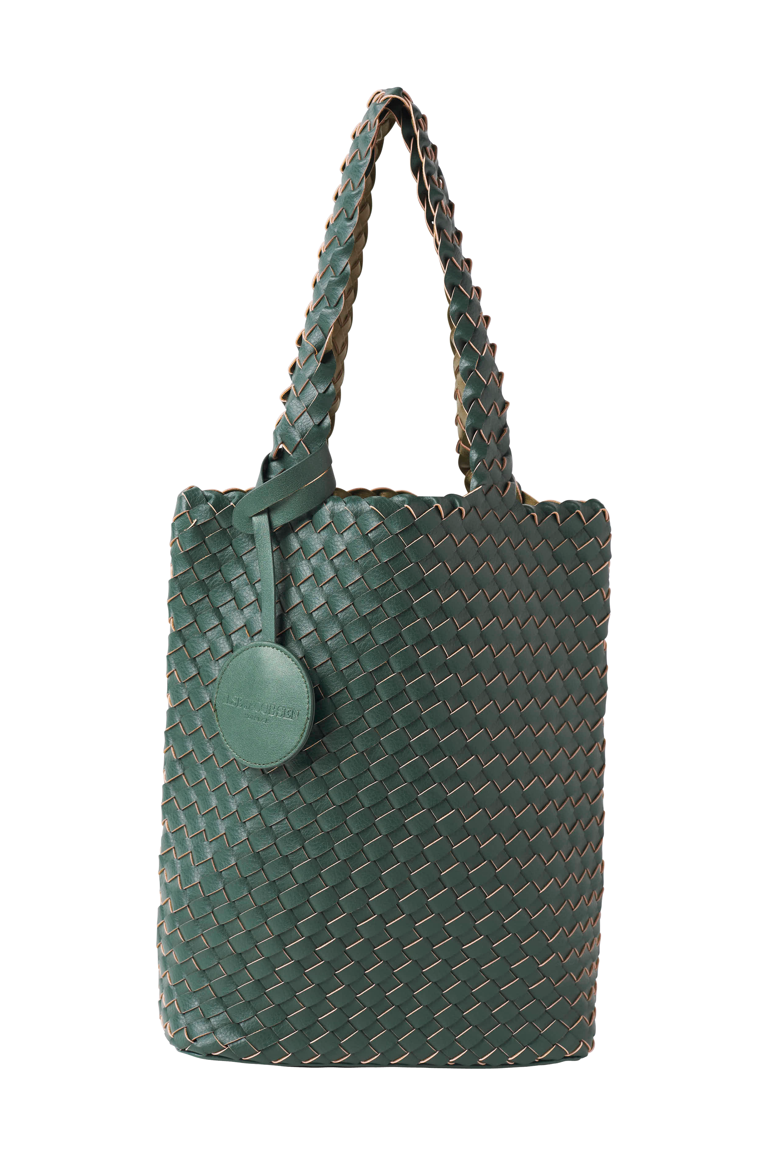 Väska gjord av flätat mjukt konstläder med två bärhandtag. Väskan är vändbar, med insidan i metallicfärg. I det ena bärhandtaget hänger en dold karbinhake för att fästa t.ex plånboken eller nycklarna. Mått: B 33 x H 32 x D 11 cm.