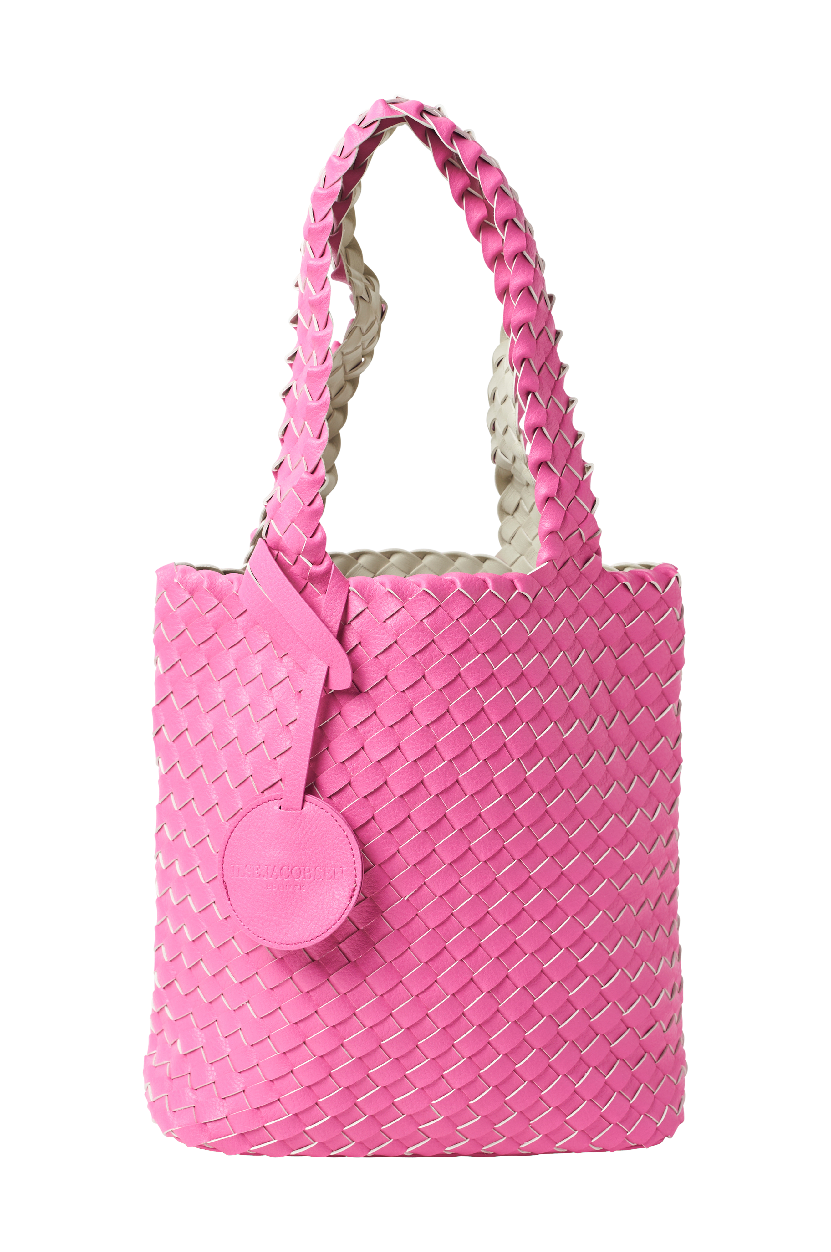 Väska gjord av flätat mjukt konstläder med två bärhandtag. Väskan är vändbar, med insidan i metallicfärg. I det ena bärhandtaget hänger en dold karbinhake för att fästa t.ex plånboken eller nycklarna. Mått: B 33 x H 32 x D 11 cm.