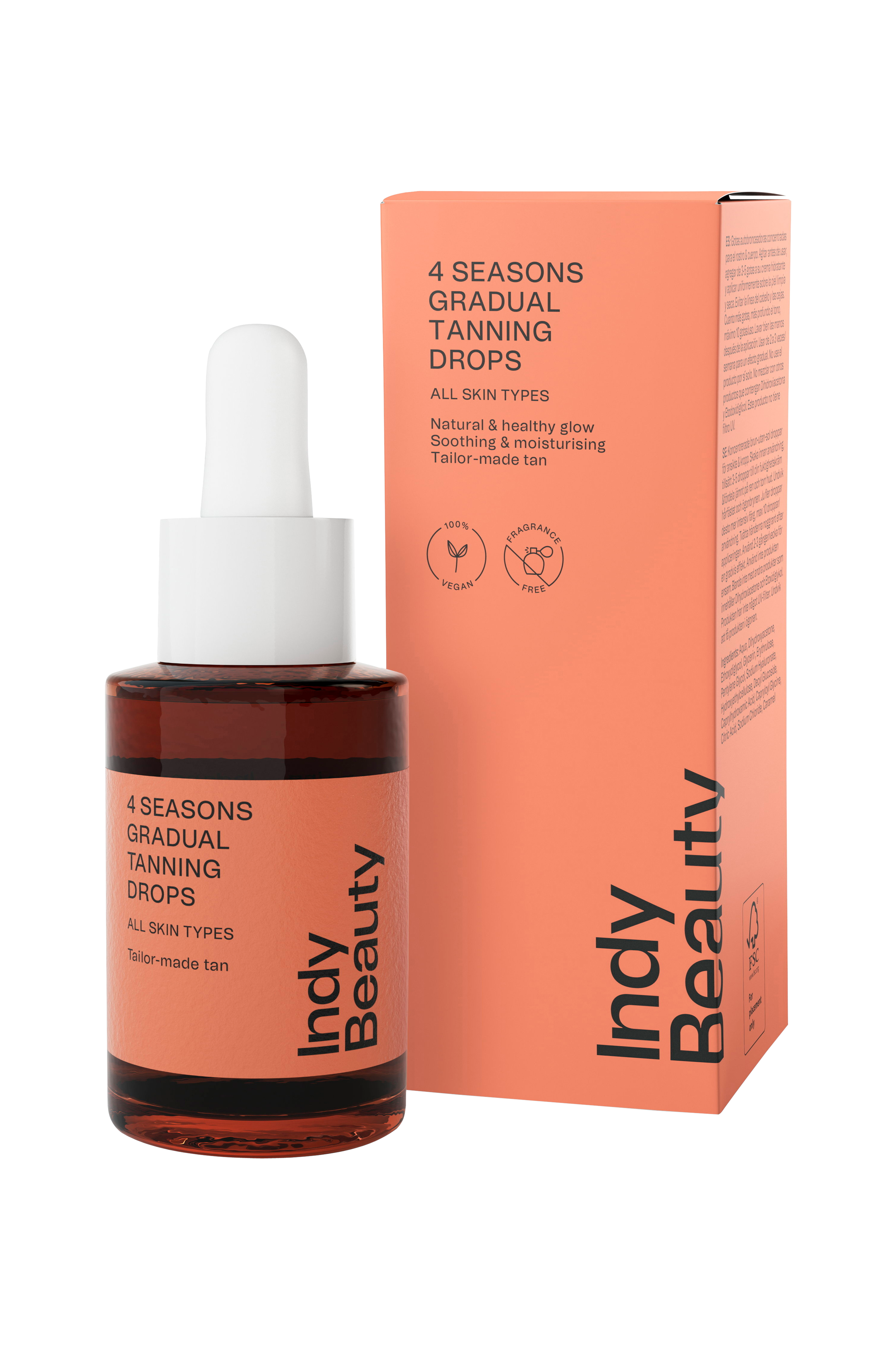 Koncentrerade tan-without-sun-droppar för ansikte och kropp som ger ett naturligt resultat och ger huden en fräsch och hälsosam lyster utan att utsätta den för solens strålar. Formulan är parfymfri och fri från kända irriterande ämnen, vilket gör den mild och skonsam även för den känsligare huden. Tillsätt 3-5 droppar i din favoritkräm och fördela jämnt över huden. Självklart fungerar dessa droppar för både ansikte och kropp, men kom ihåg att alltid blanda ut det och inte använda det ensamt på huden då det är ett koncentrat. Med dessa droppar bygger du gradvis upp en anpassad ton, precis som du vill ha den genom att använda produkten 2-3 gånger i veckan. För en mer intensiv färg använder du fler droppar, men aldrig mer än 10 droppar per område du applicerar. Blanda inte med andra brun utan sol-produkter som innehåller Dihydroxyacetone och Etoxydiglycol.