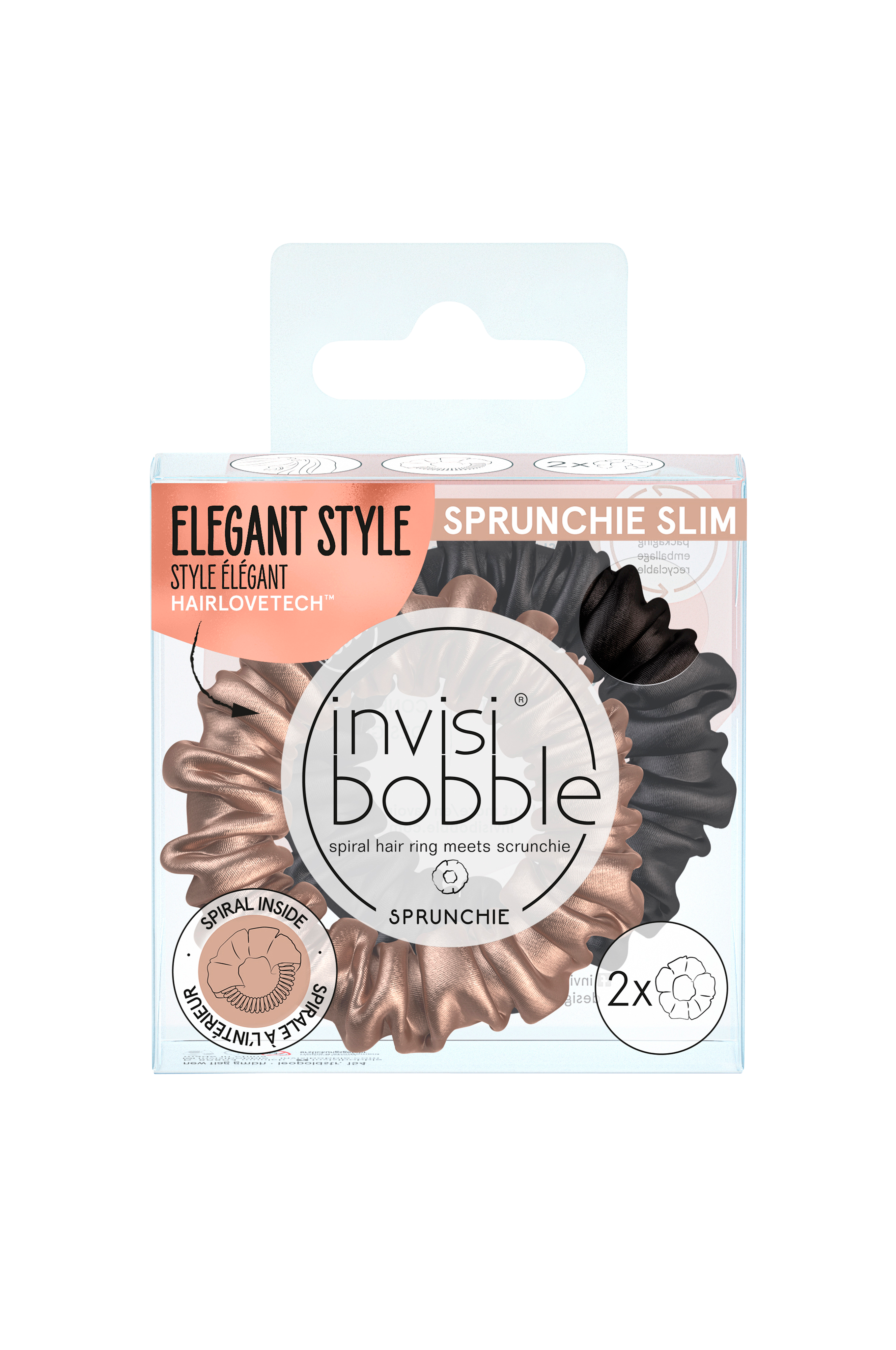 Den snygga scrunchien invisibobble Sprunchie Slim är tillverkad av ett fantastiskt sidenliknande tyg. Eftersom hårsnodden ligger dold under tyget är scrunchien lika mjuk som alla andra Invisibobbles. Den spiralformade hårsnodden inuti gör scrunchien skön att bära och lätt att dra av.