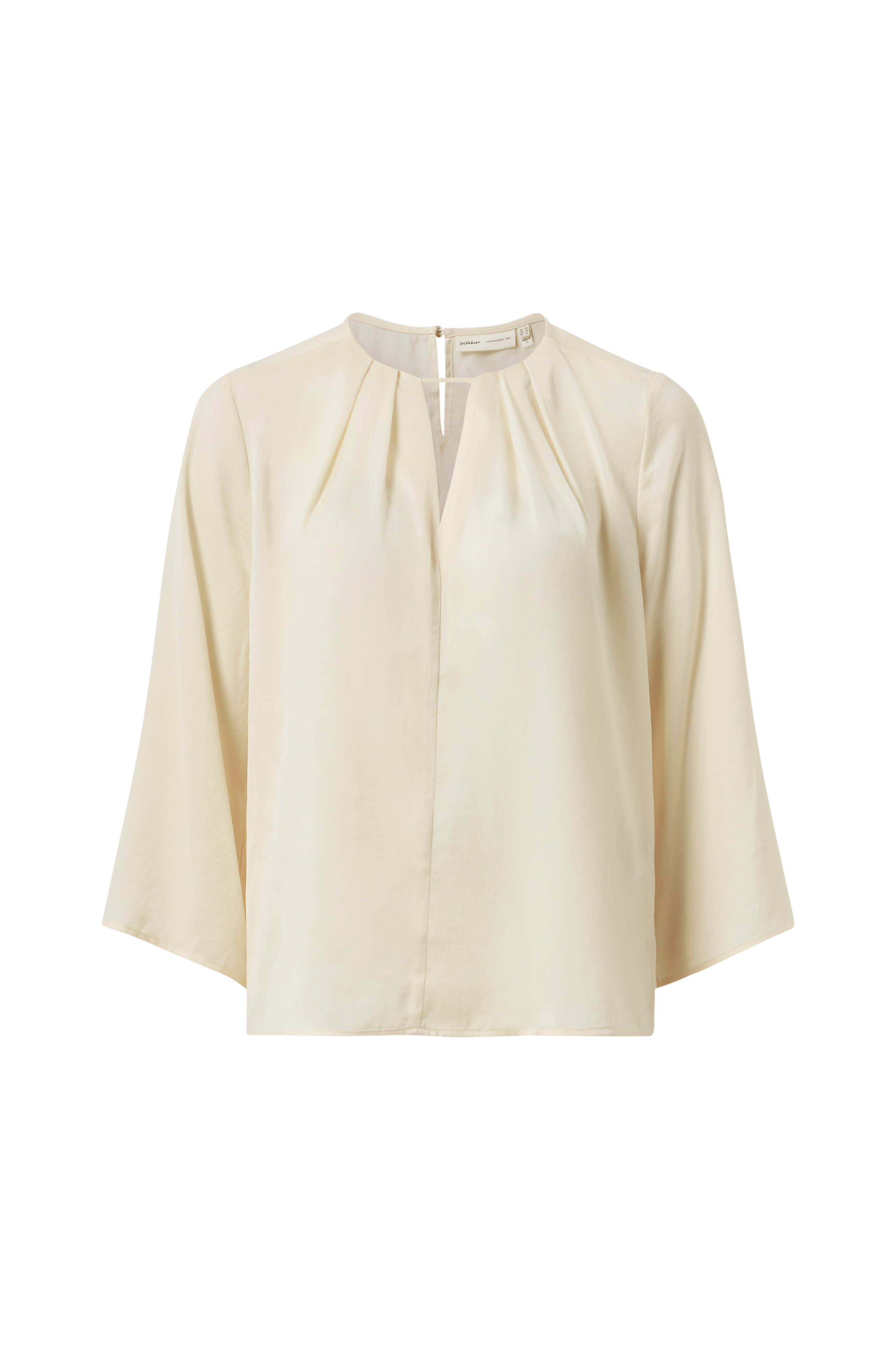 • Rak, vid modell i satin• Rund hals med sprund och veck fram• Knapp i nacken• Vid, 3/4-lång ärm