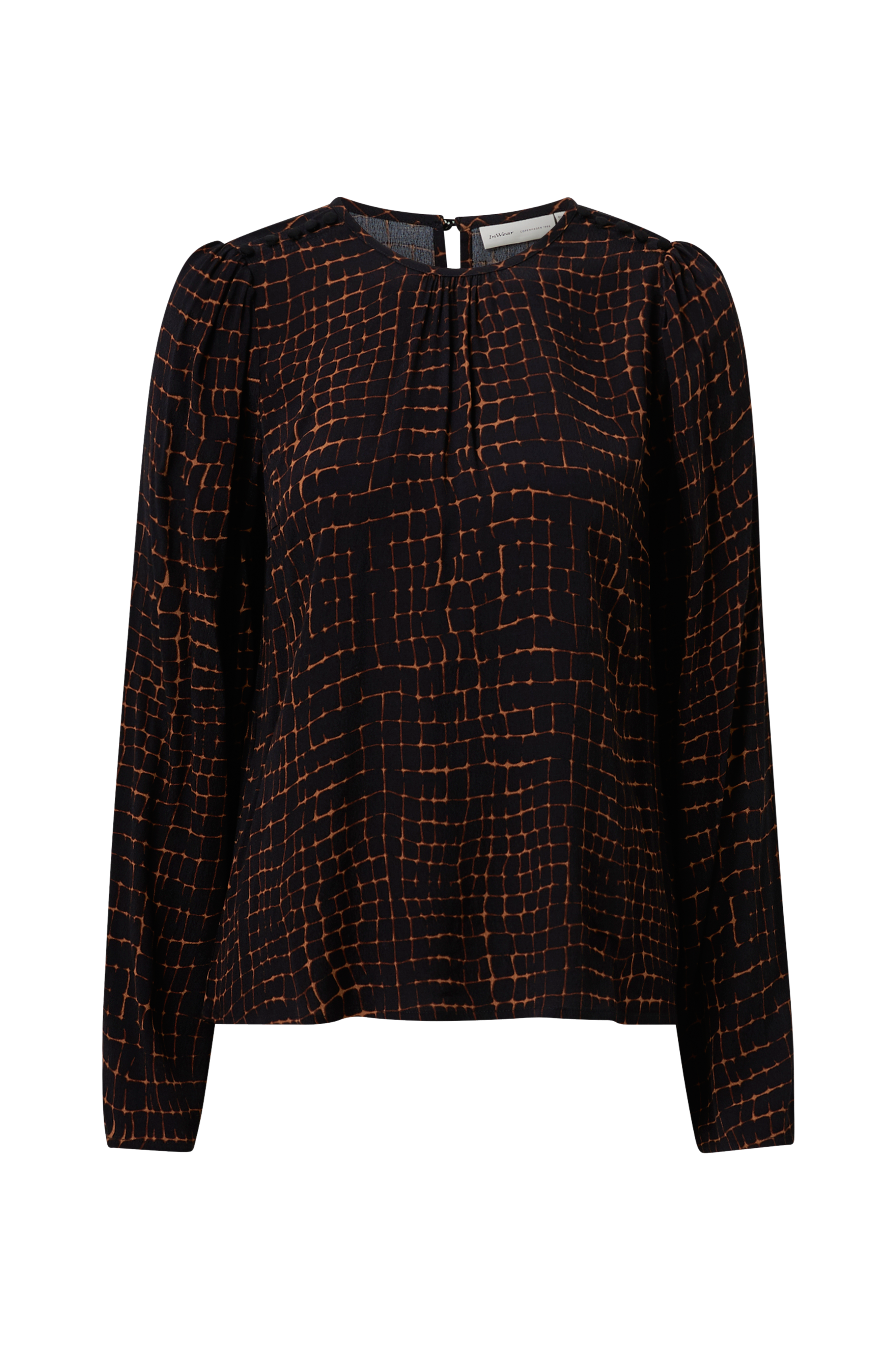 Blus PavoIW Blouse från InWear i vävd, kräppad kvalitet. Rund hals med rynk fram, dekorativa, klädda knappar på axlarna och långa, något vidare ärmar.