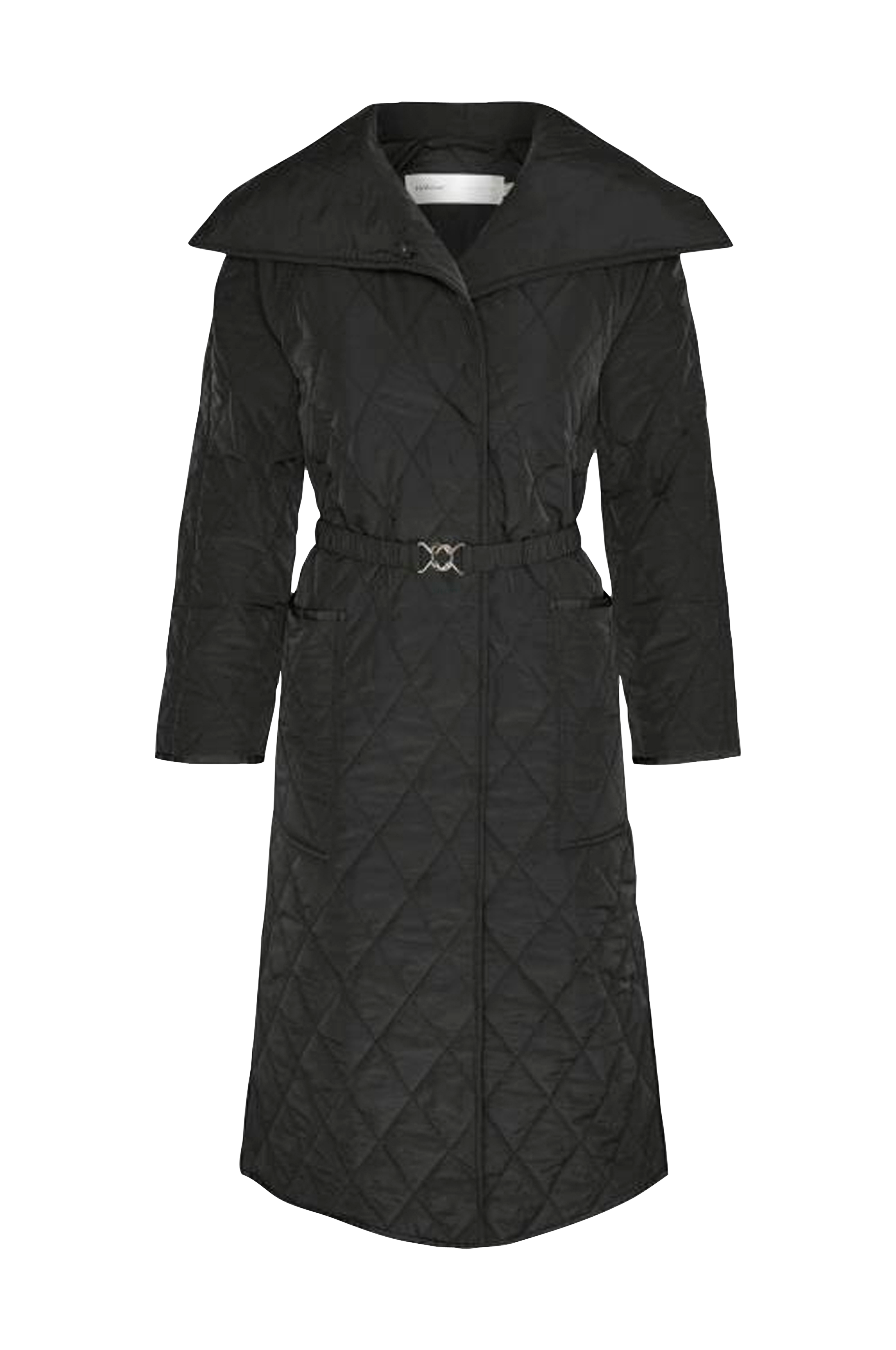 Quiltad och lätt vadderad kappa. Vattenavisande yttertyg med lätt struktur. Stor krage och dolda tryckknappar. Två fickor och slitsar i sidorna. Längd ca 119 cm i stl 36.
