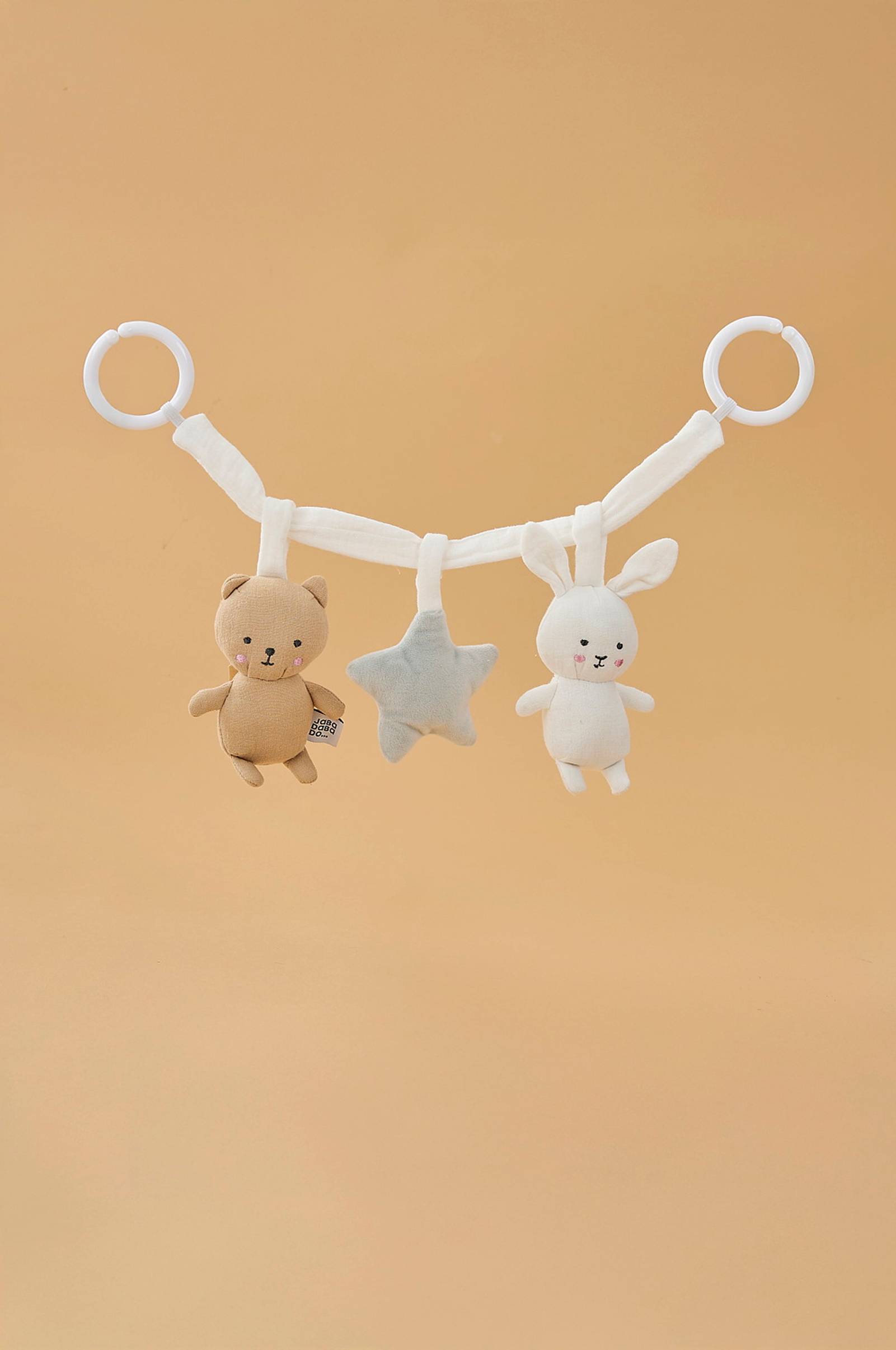 Söt barnvagnsleksak med söta teddys och kaniner. Barnvagnsleksaken underhåller ditt barn under promenaden och skapar en känsla av lycka och komfort. Fästs enkelt med elastiskt plastsnöre. Passar de flesta barnvagnar.