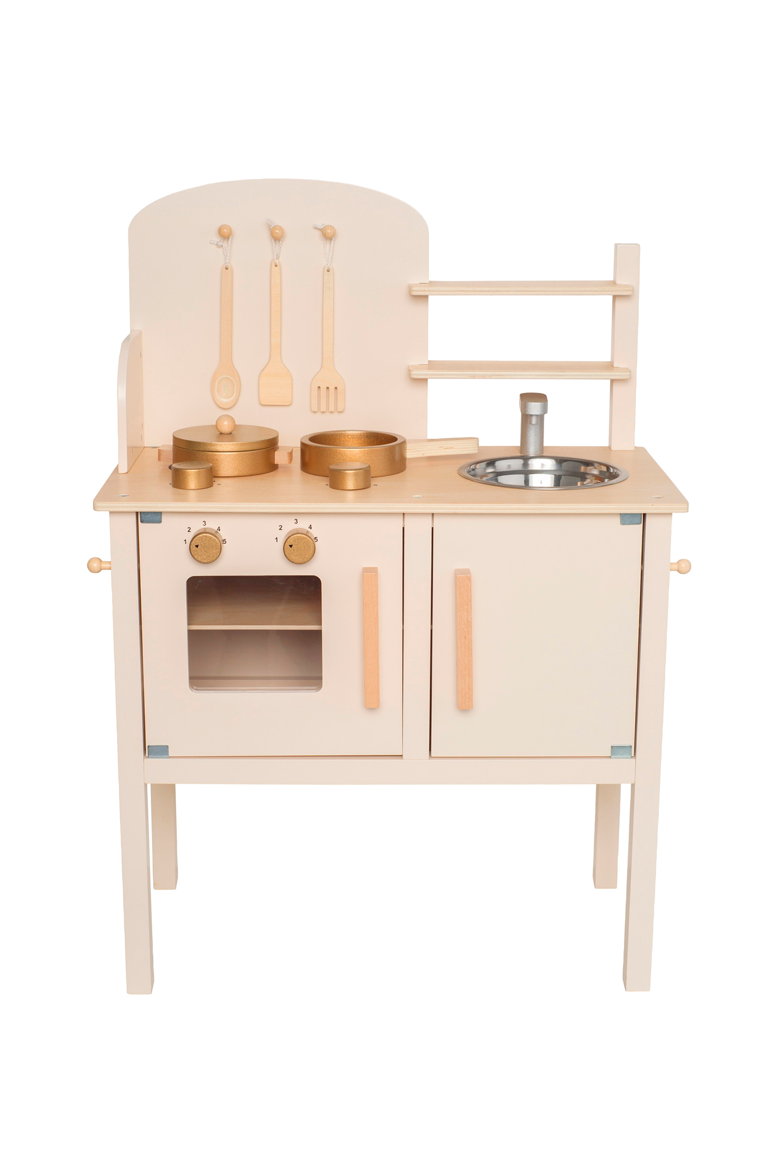 Köket är utrustat med en spishäll, ugn, diskho, förvaringsskåp samt två förvaringshyllor med gott om plats till alla kökstillbehör. Luckorna går att öppna och på spishällen finns 2 kokplattor med tillhörande skruvbara knappar så du kan reglera värmen. När du är färdig i köket kan du diska rent disken i vasken. På väggen finns krokar att hänga upp köksredskapen på och två fina kastruller ingår.