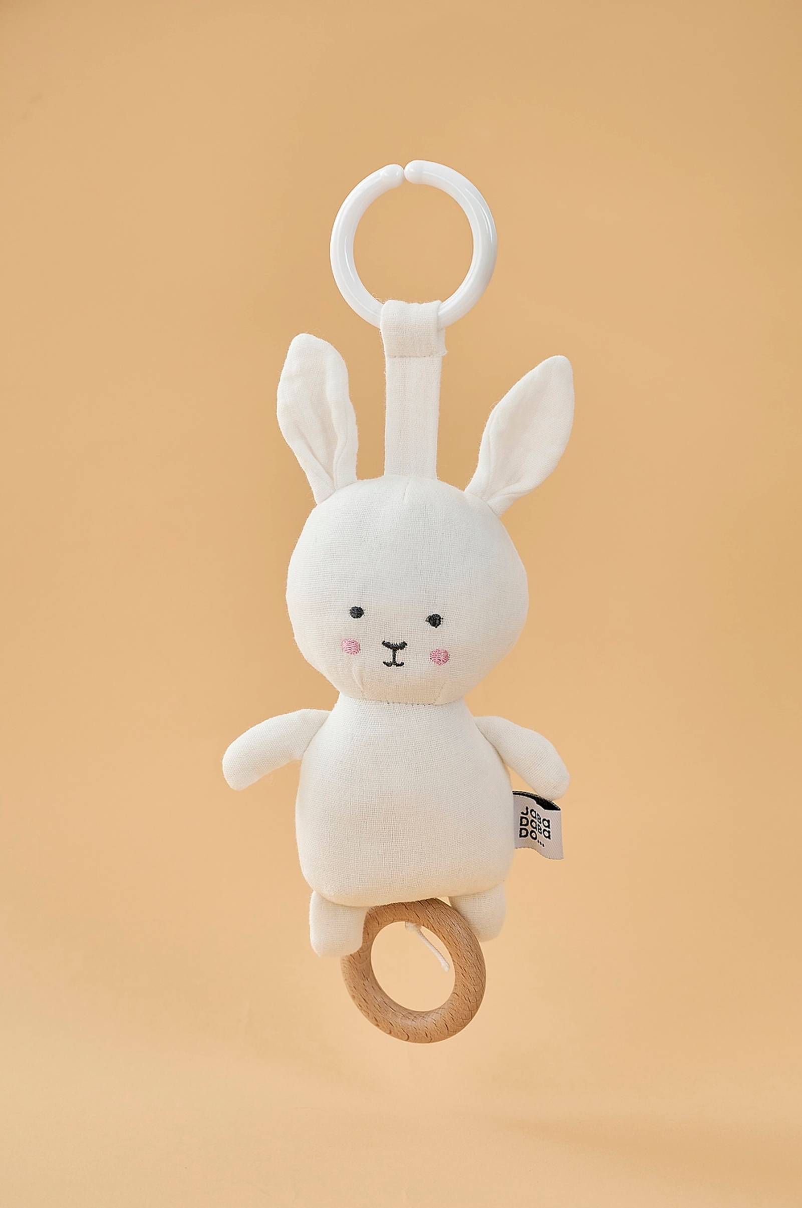 Söt musikal i form av en kanin att hänga i barnvagnen. Låt ditt barn somna med en lugnande melodi. för att aktivera musikfunktionen, dra i den hängande träringen så spelar leksaken en vaggvisa. Speldosan är lätt att fästa och fungerar nästan överallt.