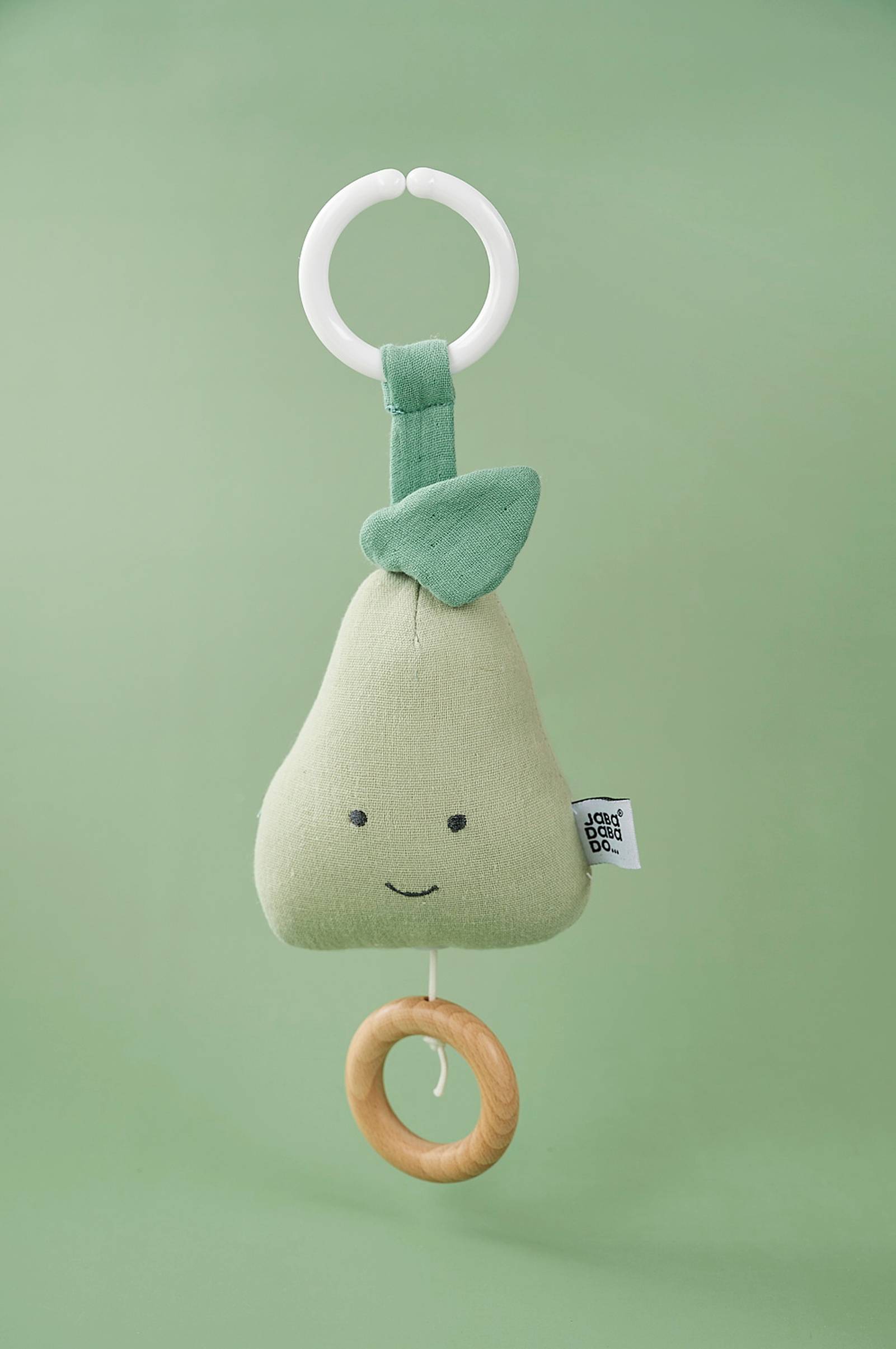 Jabadabados textila musikal är utformad som ett sött päron. Musikalen spelar en lugn melodi (brahms lullaby) och monteras enkelt på plats med hjälp av en elastisk ring som fungerar på de flesta ställen. Musiken underhåller och stimulerar barnet medan musiken spelas och är en fin present till den nyfödda eller som dopgåva.