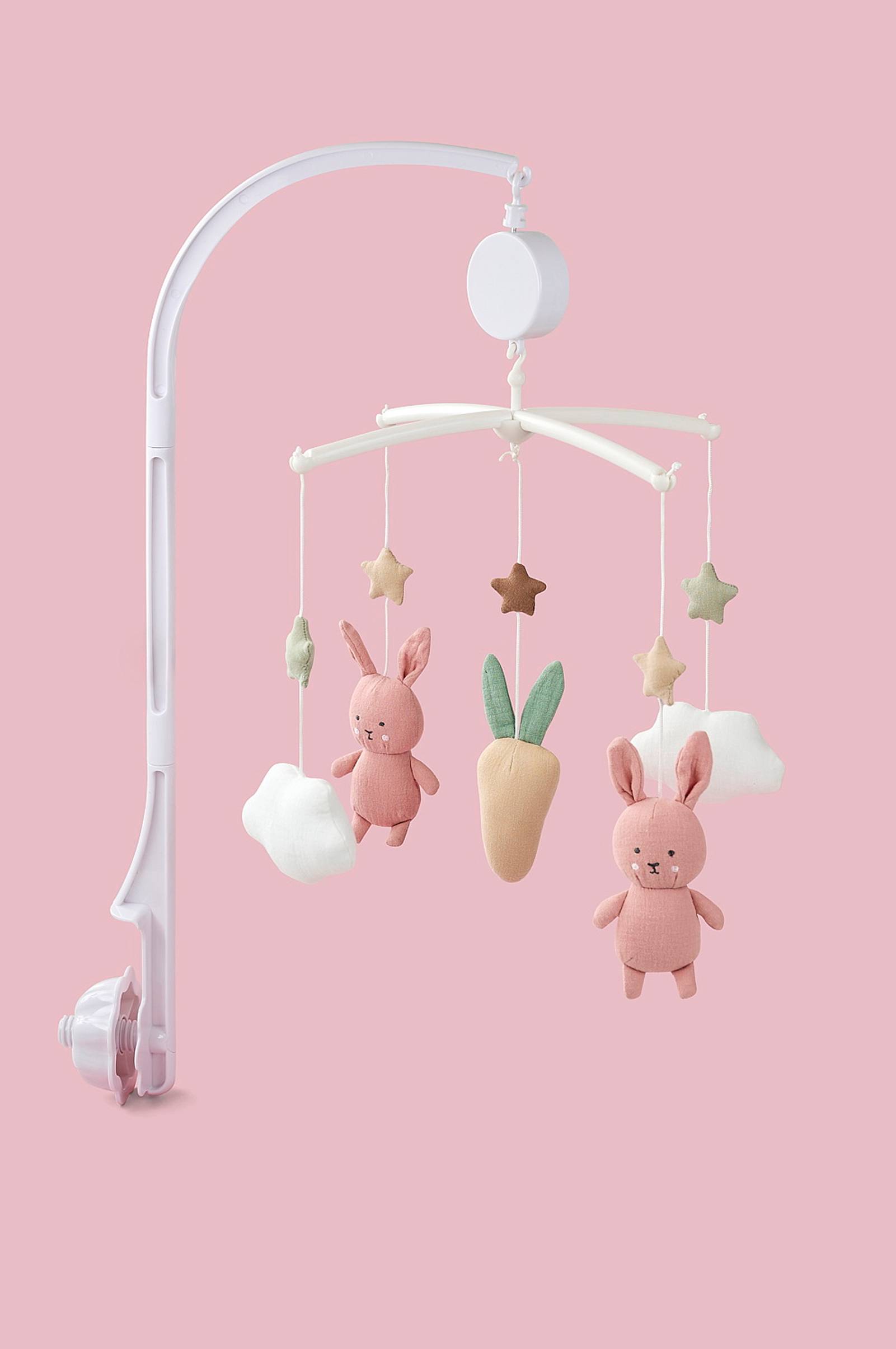 Sov gott! Jabadabados musikmobil med moln, stjärnor, två kaniner i rosa och en morot är perfekt att hänga ovanför skötbordet eller spjälsängen. Speldosan spelar en lugn vaggvisa (Brahms lullaby) och figurerna snurrar sakta runt när mobilen sätts på. Vaggvisan har en lugnande effekt på barnet och de rörliga figurerna underhåller barnet medan du t.ex. byter blöja. En vit mobilarm som kan fästas på skötbordet eller spjälsängen (max 40 mm) ingår. Musikmobilen med sin melodi och sina söta figurer stimulerar barnets syn och hörsel när den används.