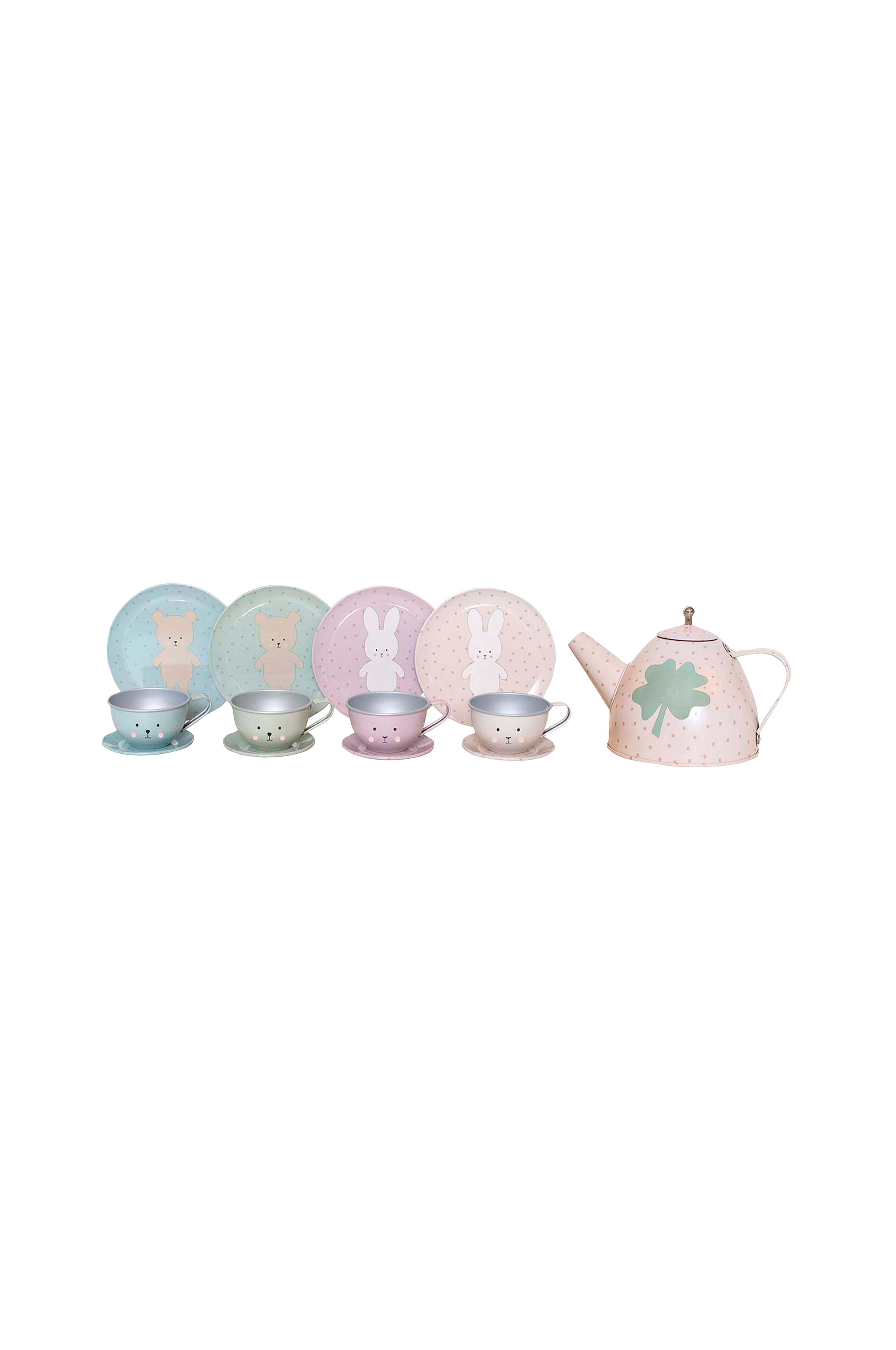 Komplett liten teservis i 15 delar med alla tillbehör som behövs till tebjudningen. Duka upp och bjud dina nallar på fika. Gullig teservis i plåt med teddy & bunny på.