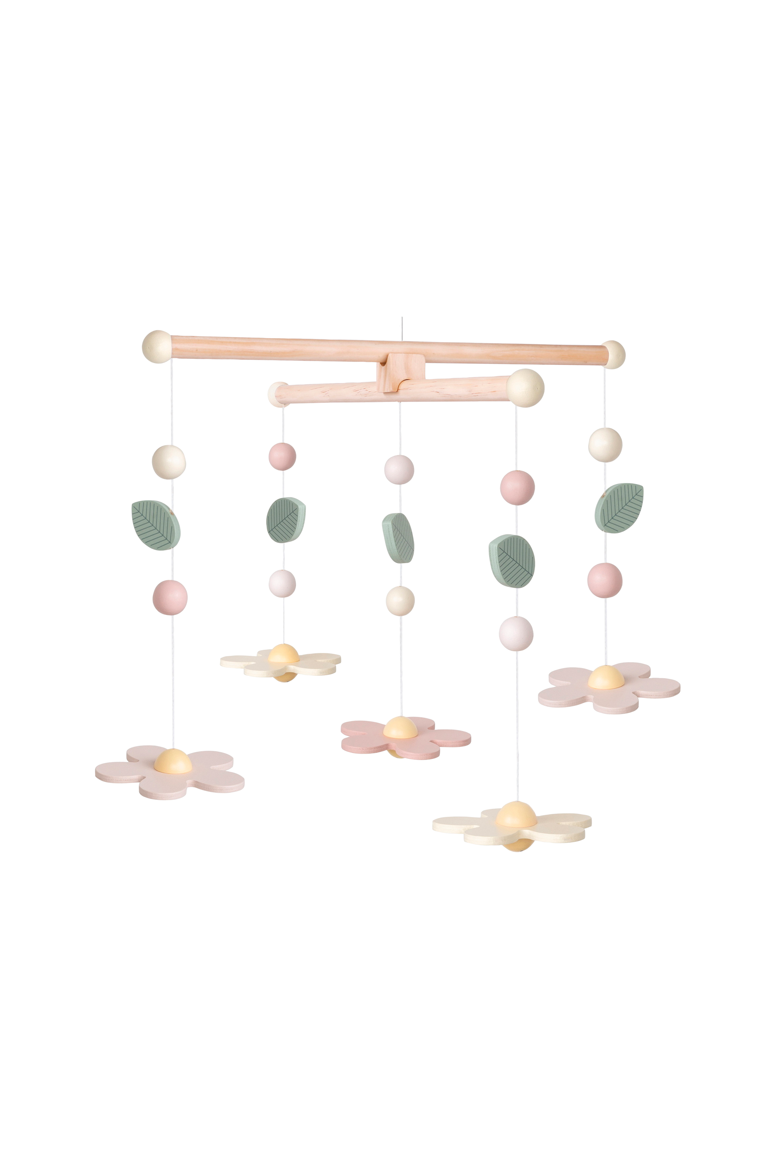 Vår bedårande babymobil i trä med sina små blommor har glada små ansikten på undersidan och är den perfekta dekorationen för att hänga över spjälsängen eller skötbordet.