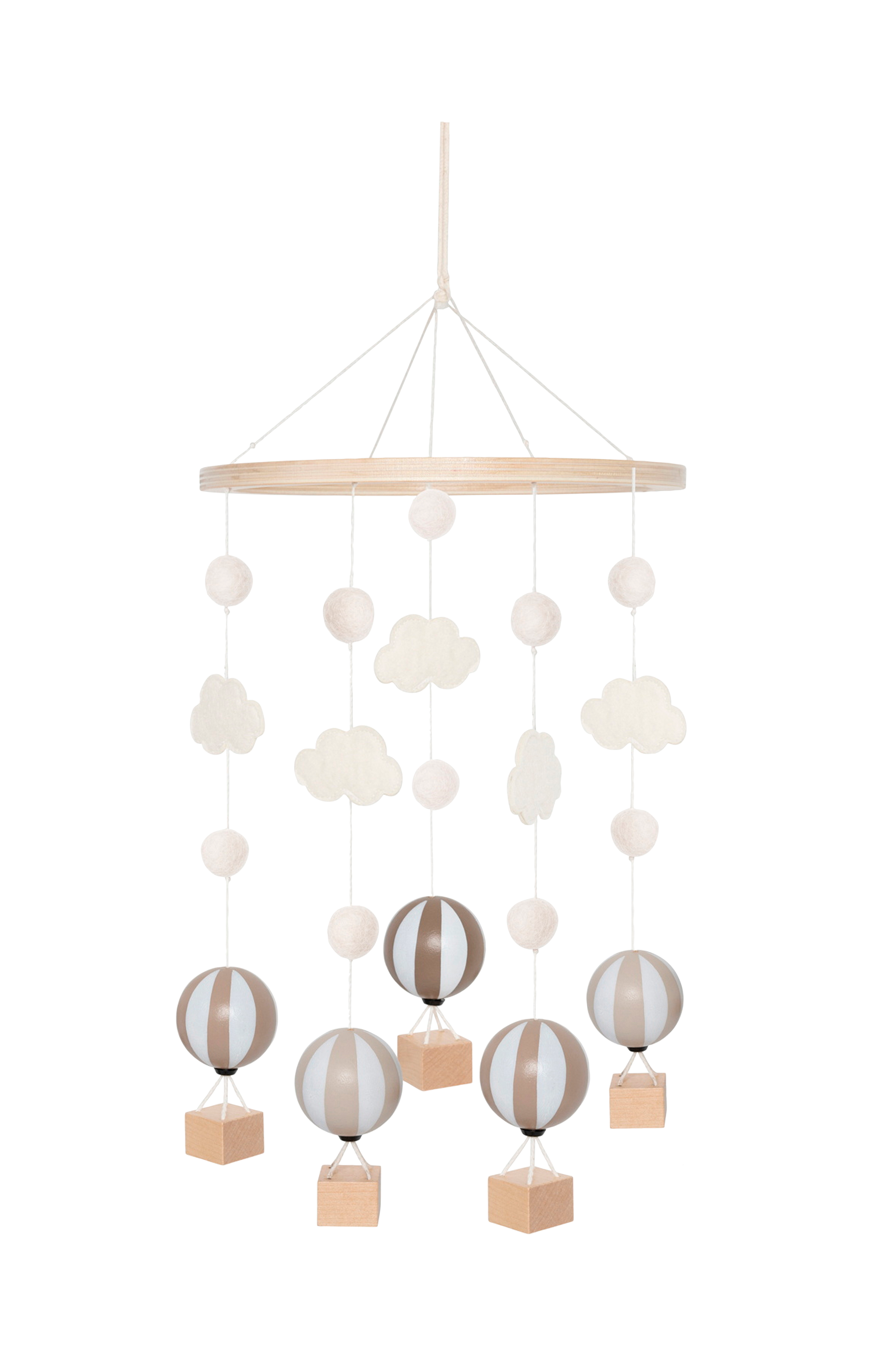 Vår bedårande babymobil i trä med små luftballonger som svävar är den perfekta dekorationen för att hänga över spjälsängen eller skötbordet.