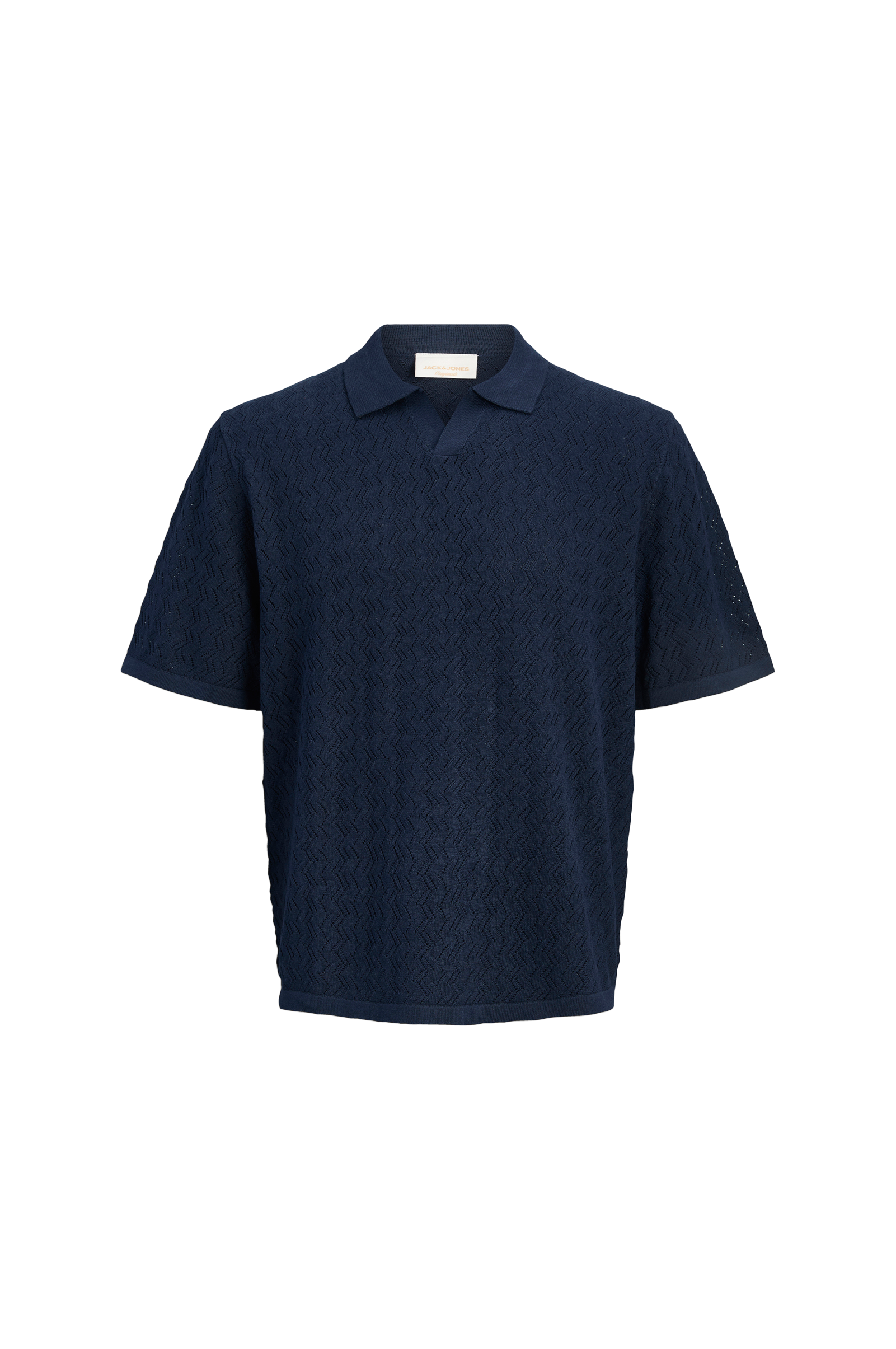 • Kortärmad, mönsterstickad pikétröja• V-ringad hals med ribbad krage• Ribbstickning i ärmsluten och i nederkanten