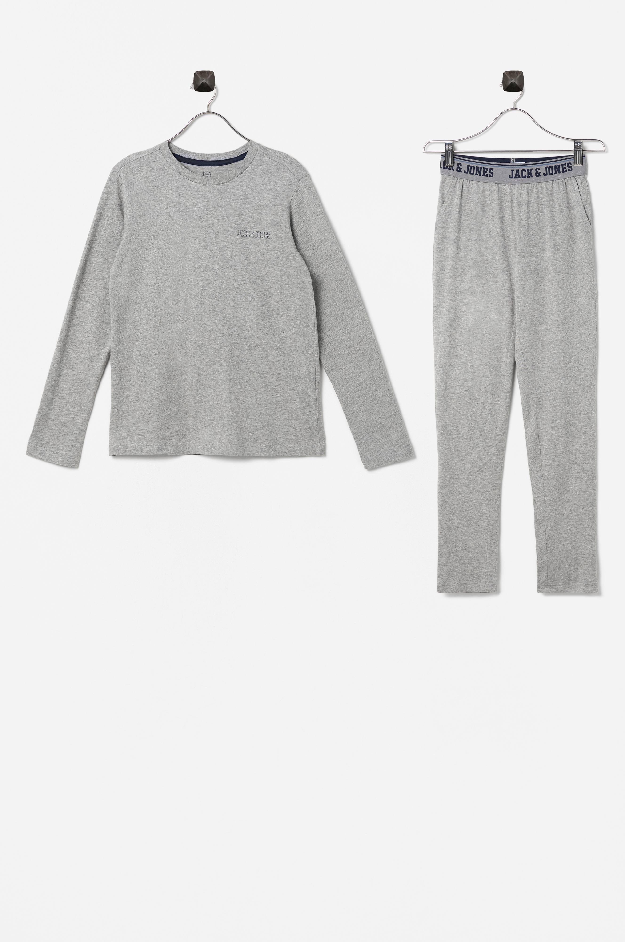 Set i mjuk trikå med långärmad t-shirt och byxor. T-shirten har rund, ribbad halsringning. T-shirten har resårmidja med logga runt om.