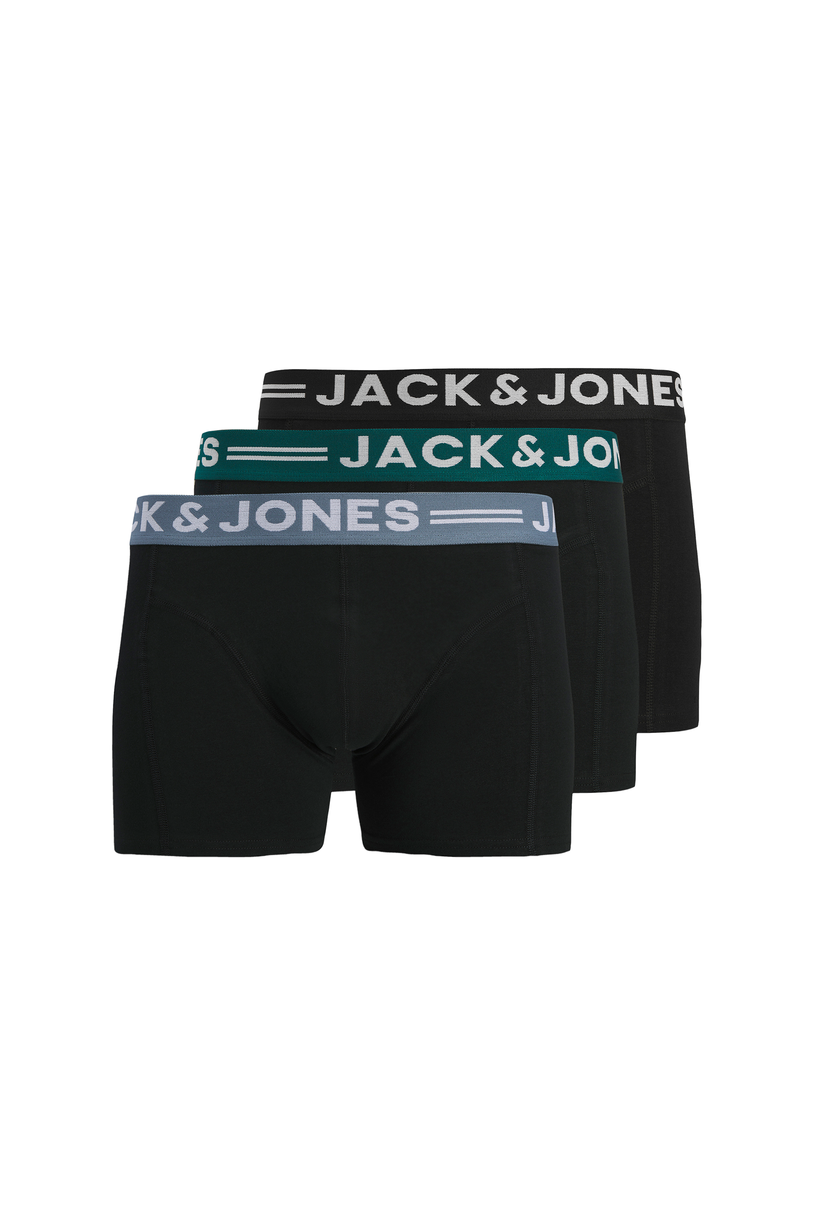 Kalsonger Sense Trunks i 3-pack från Jack & Jones i mjuk, stretchig bomullstrikå. Resårlinning med logo runt om. Fodrade fram. Tre enfärgade.
