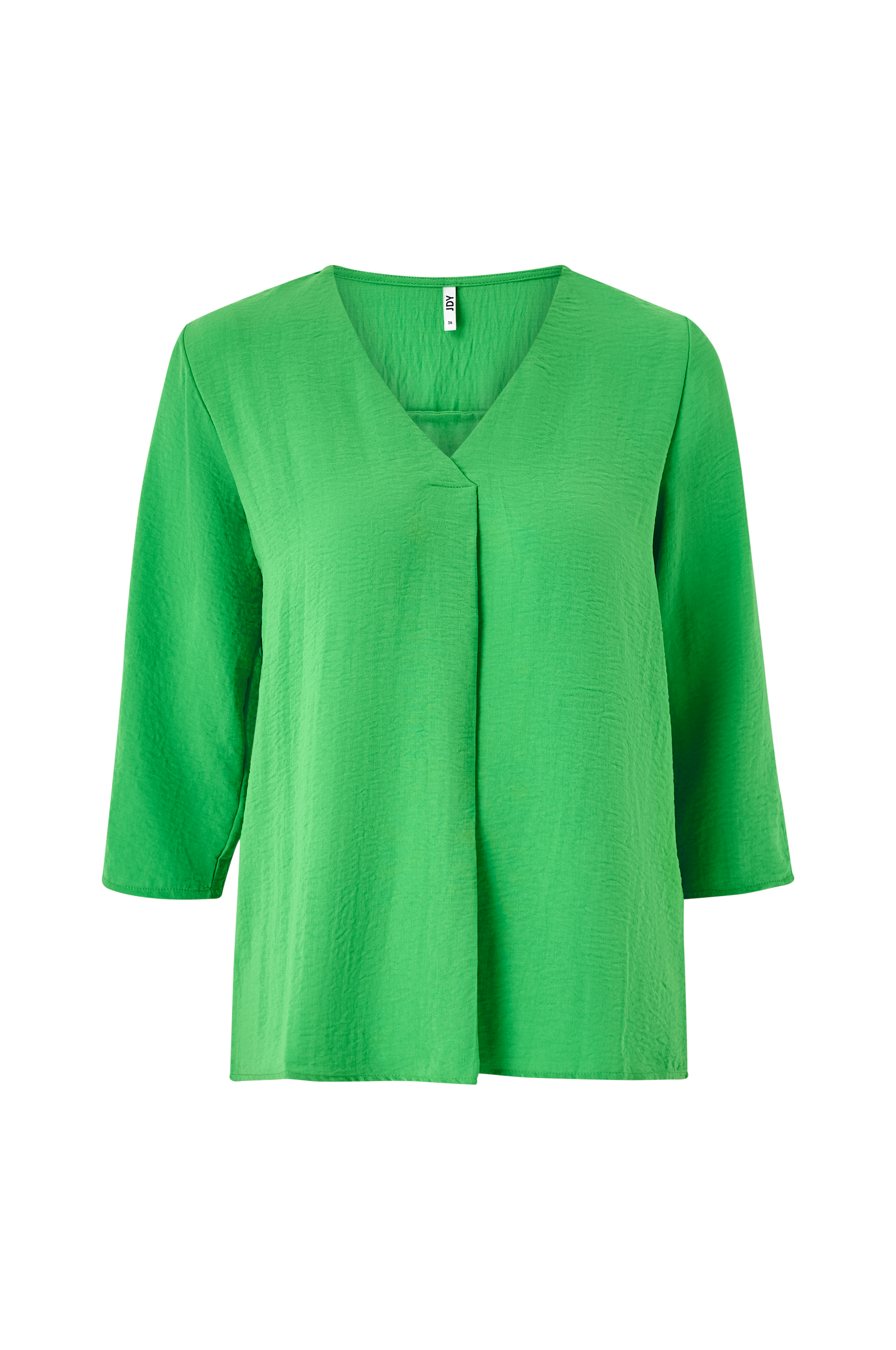 Blus i mjuk, vävd kvalitet med lätt struktur i tyget. V-ringad hals och veck fram. Ärm i 3/4-längd som kan rullas upp och fästas med knäpptamp. Något längre bak.