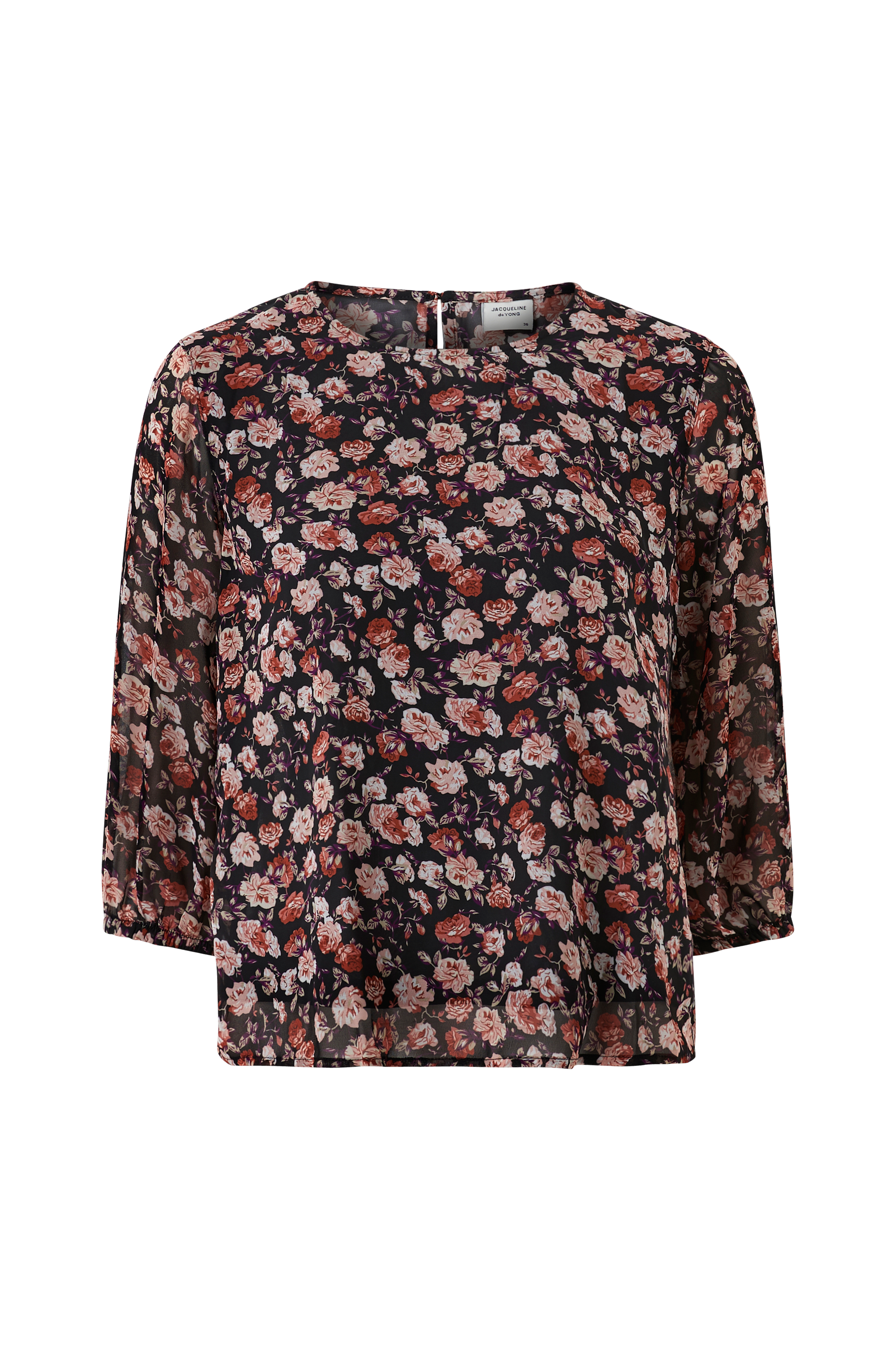 Blommig blus i tunn, transparent chiffong. Tunt foder fram. 3/4-långa ärmar med elastiska ärmslut och rund hals med sprund och knapp i nacken.