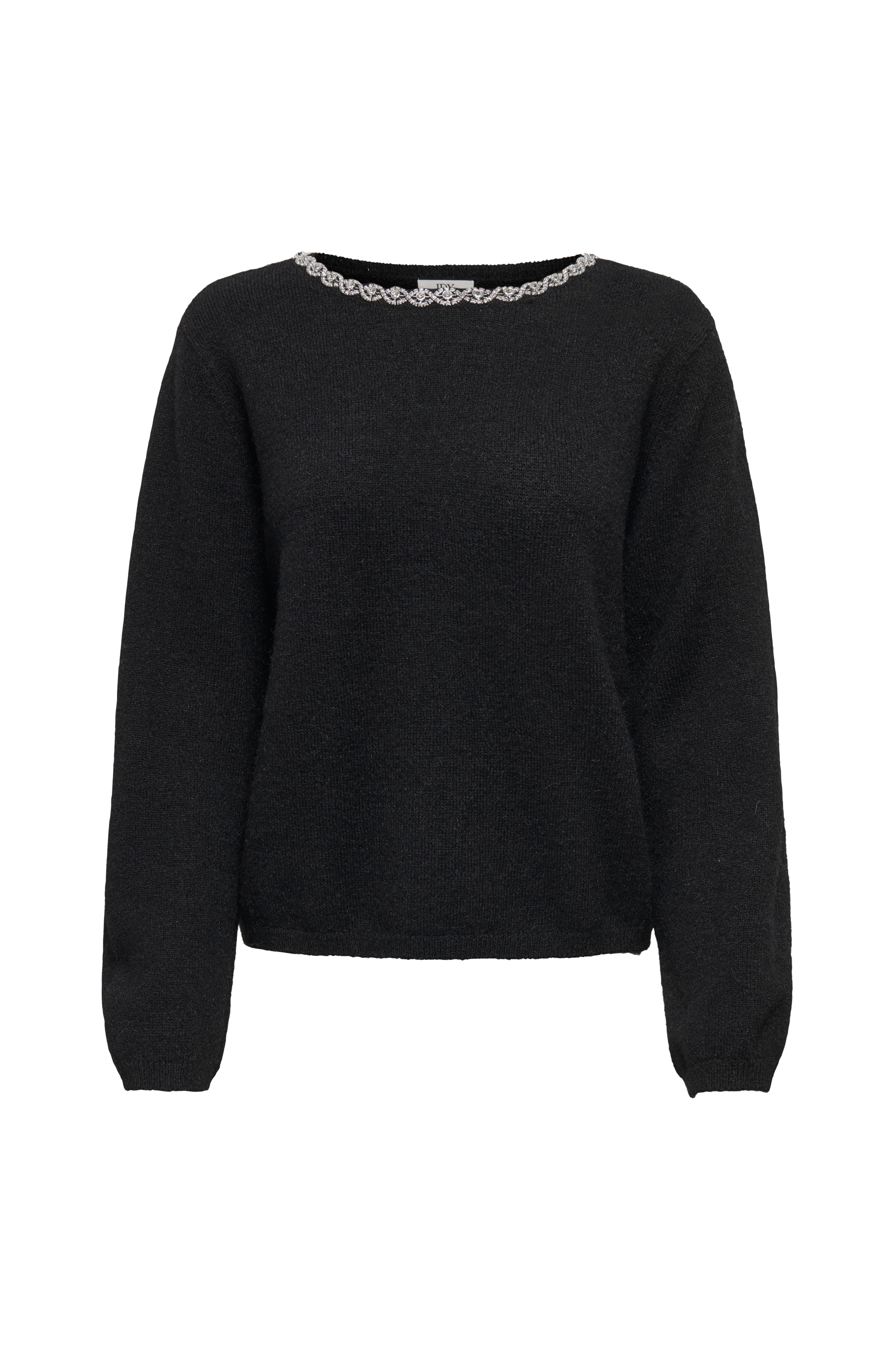 • Finstickad tröja med dekorativa strasstenar längs halsringningen