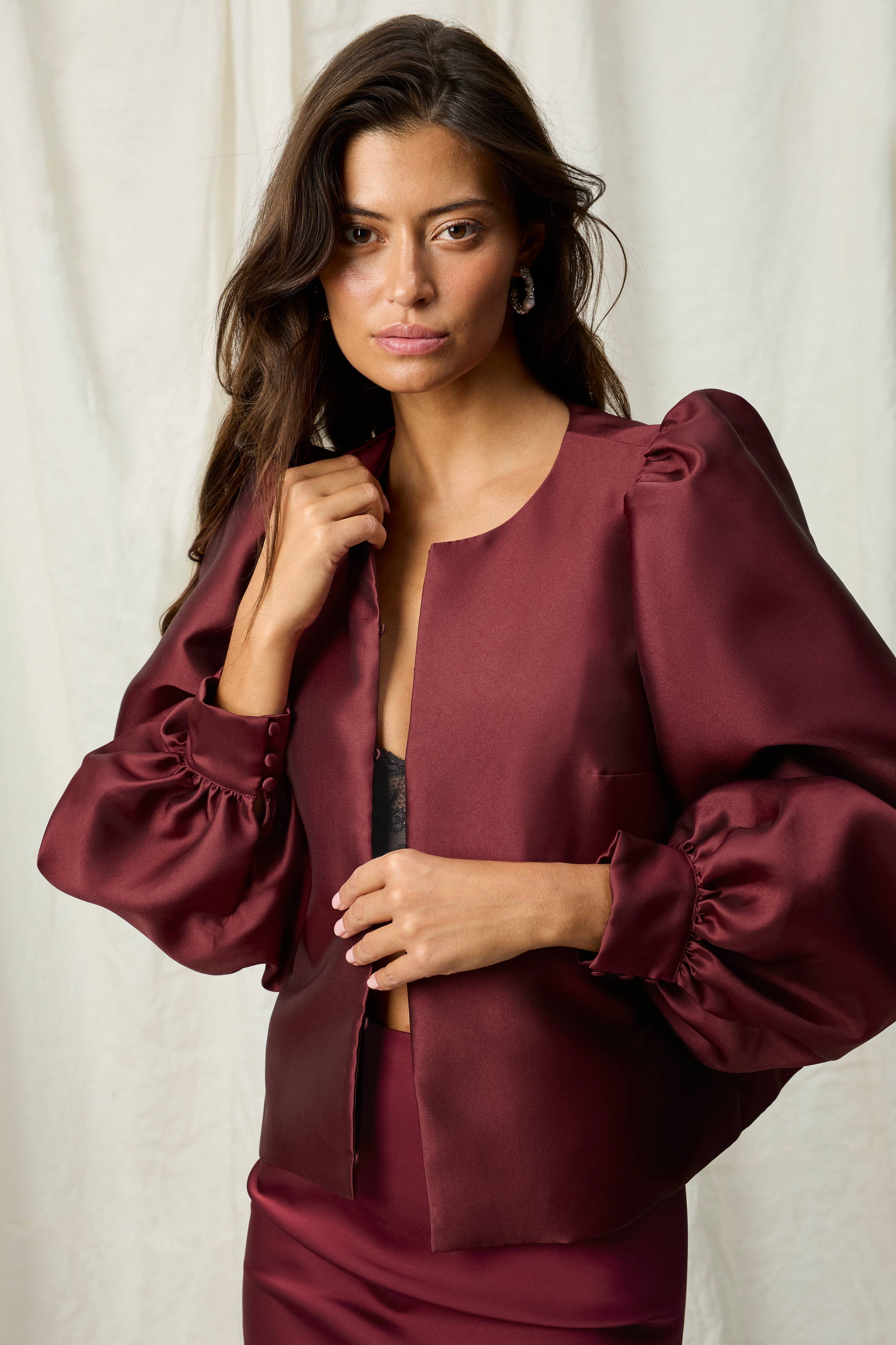 En fantastiskt välsydd blus eller lättare vår och sommar jacka med fin lyster. Volymiösa ärmar som sätter extra touchen på plagget. Lagom kort och perfekt mörkare vinröd som passar d…