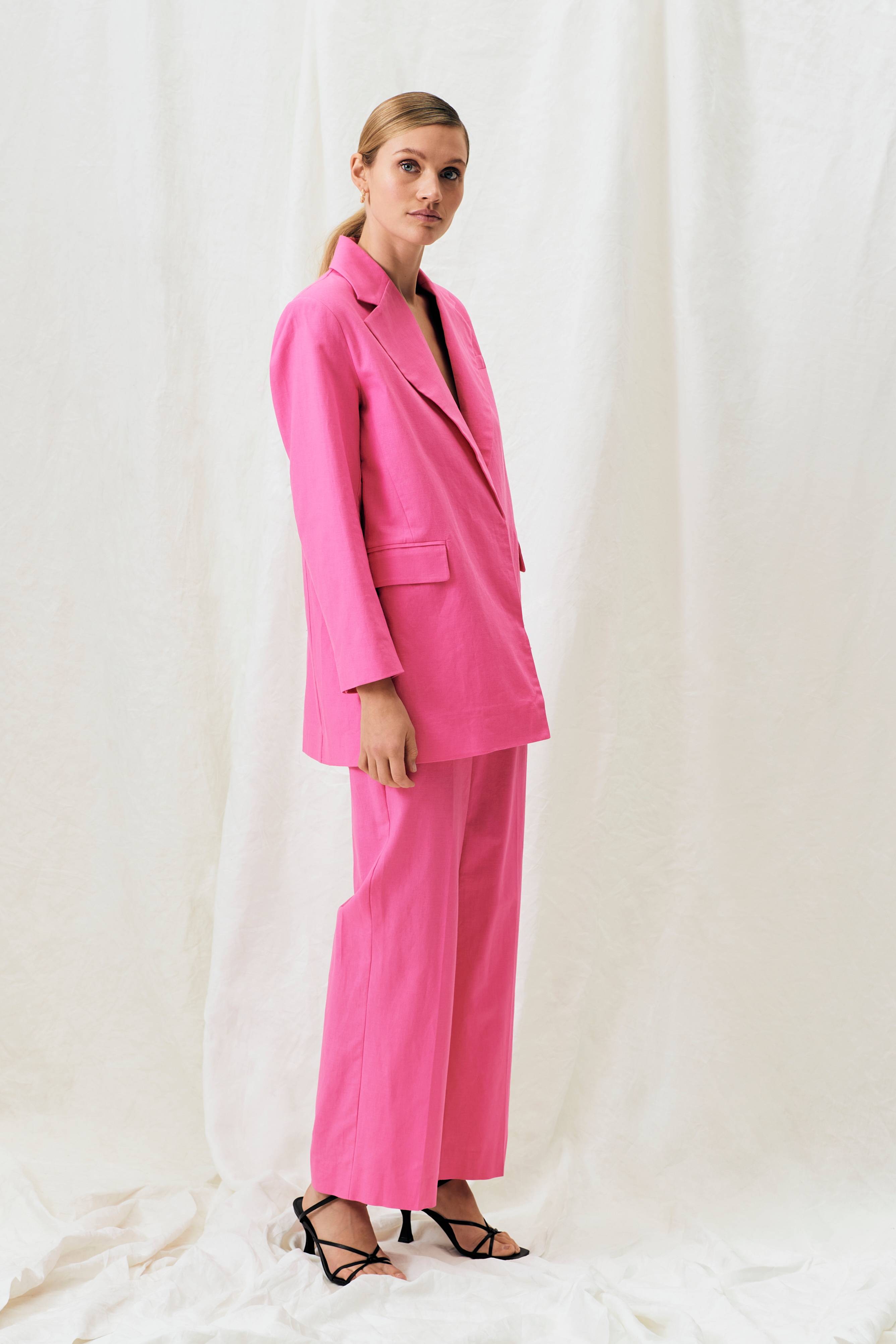 • Ankellång modell med raka, vida ben• Pressveck• Extra hög midja med hysk- och hakestängning• Två fickor fram• Fuskfickor bak• Vävd kvalitet med struktur