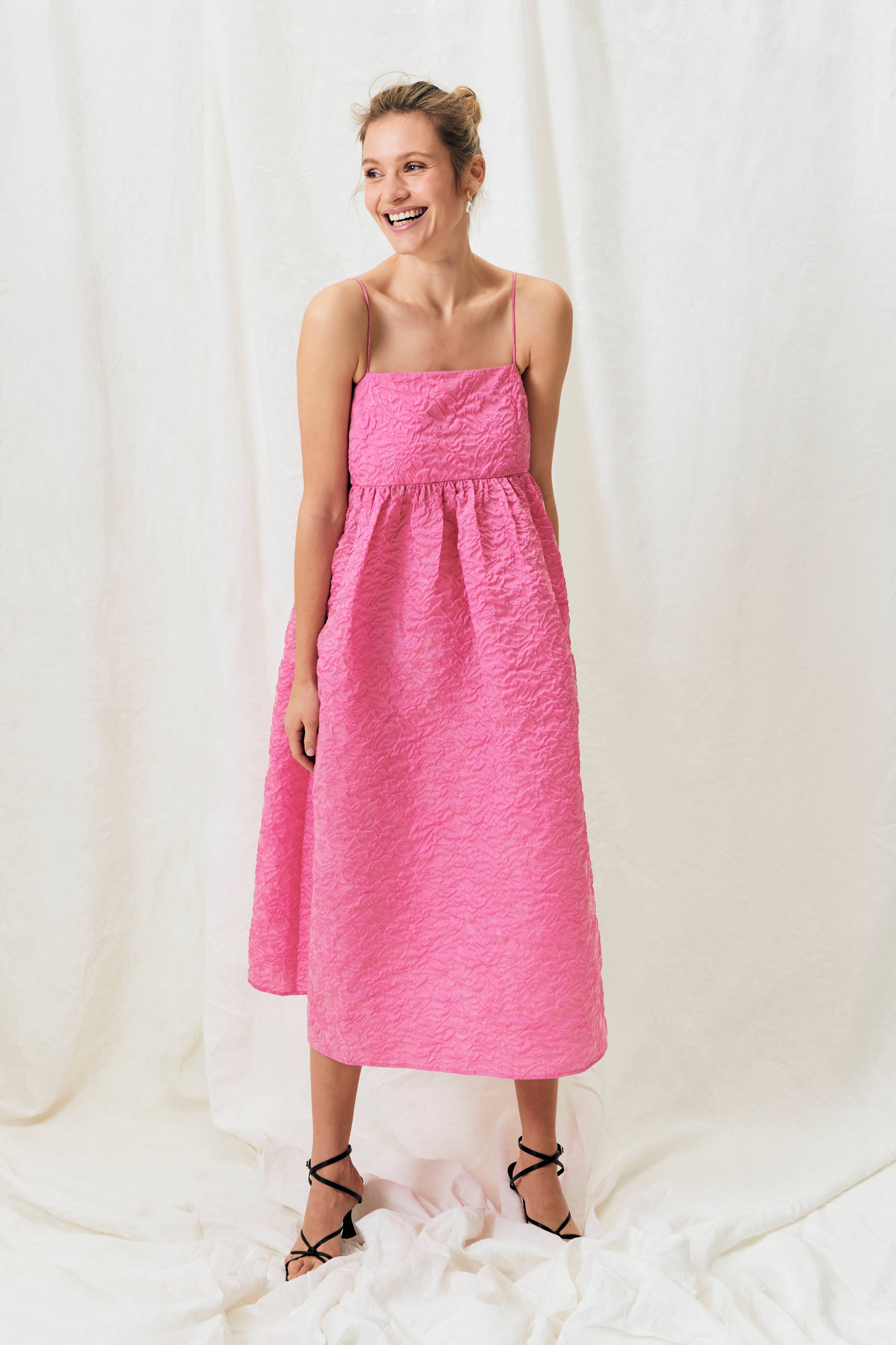 Festklänning med utställd kjol med mycket volym. Rynkad avskärning under bysten och smala, nätta axelband. Gjord i en kraftig men lättviktig kvalitet med bubbligt strukturmönster och styrsel som ger fin volym. Längd ca 121 cm i stl 34/36.