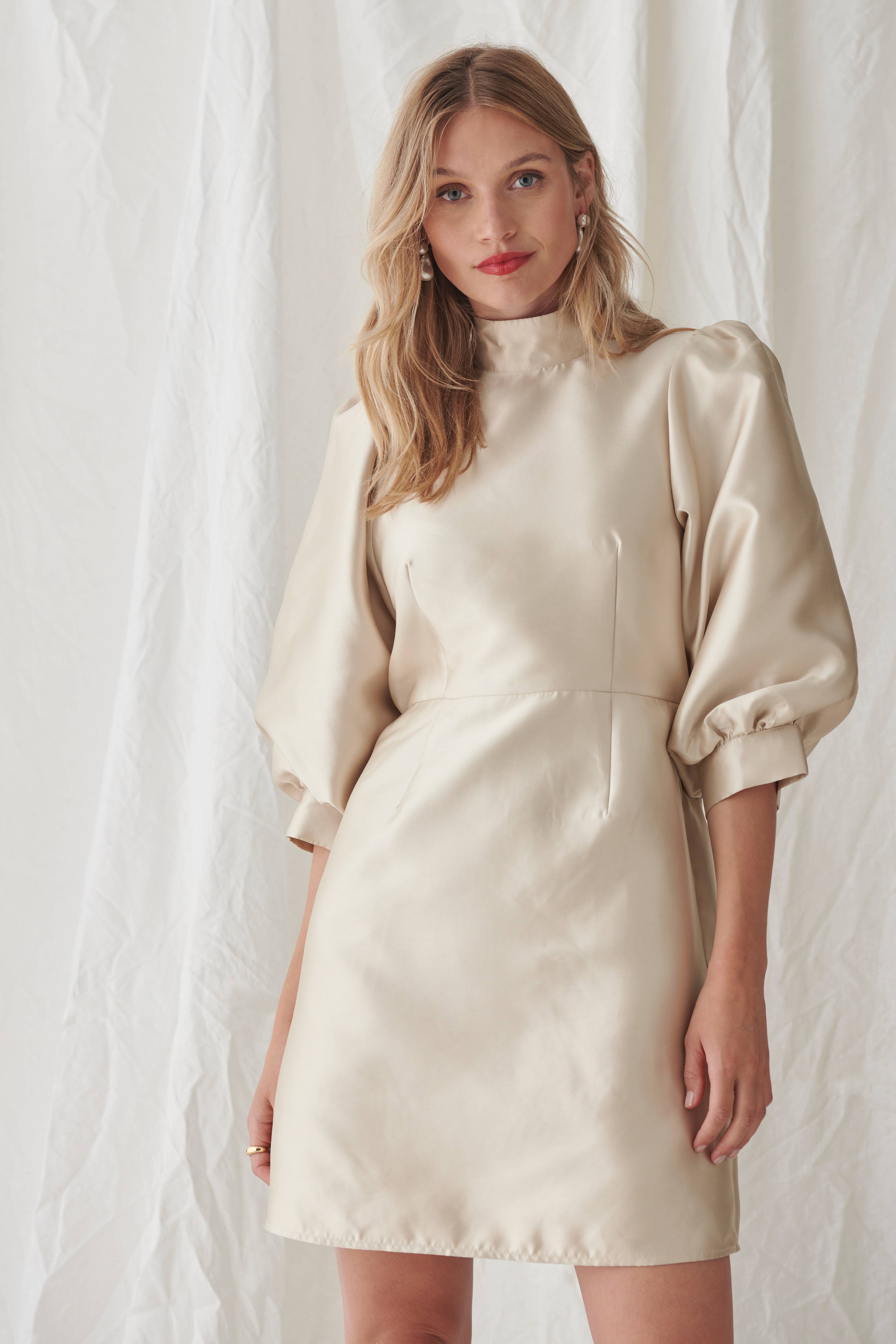 • Lätt, figurformad modell i satin• Hög krage med knappar i nacken• Markerad midja• 3/4-lång ballongärm med kant i ärmsluten• Längd: 89 cm i storlek S