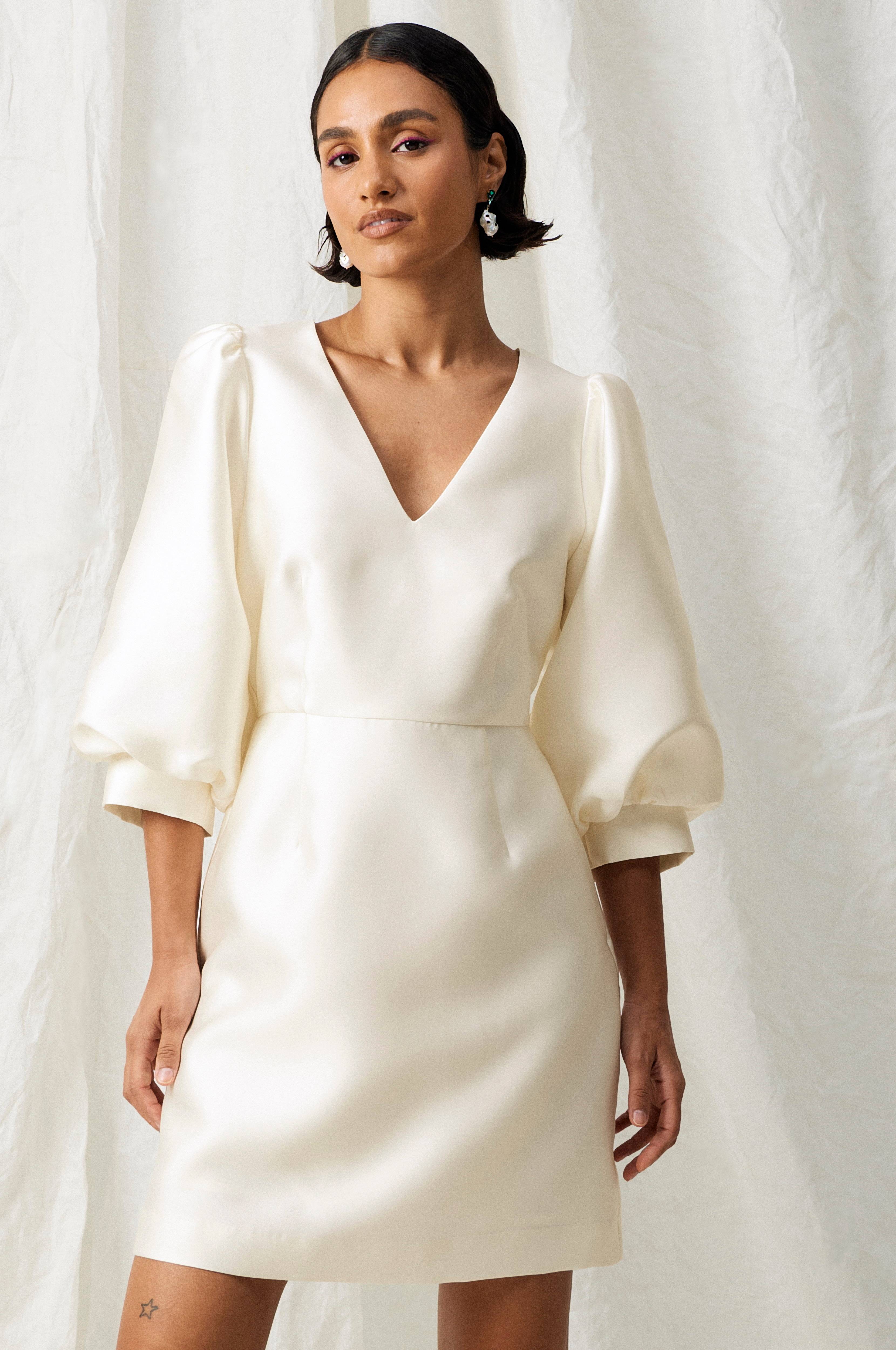 • Festklänning i satin• V-ringning• 3/4-långa, voluminösa puffärmar• Resår bak i midjan• Fodrad• Längd: 88 cm i storlek 36