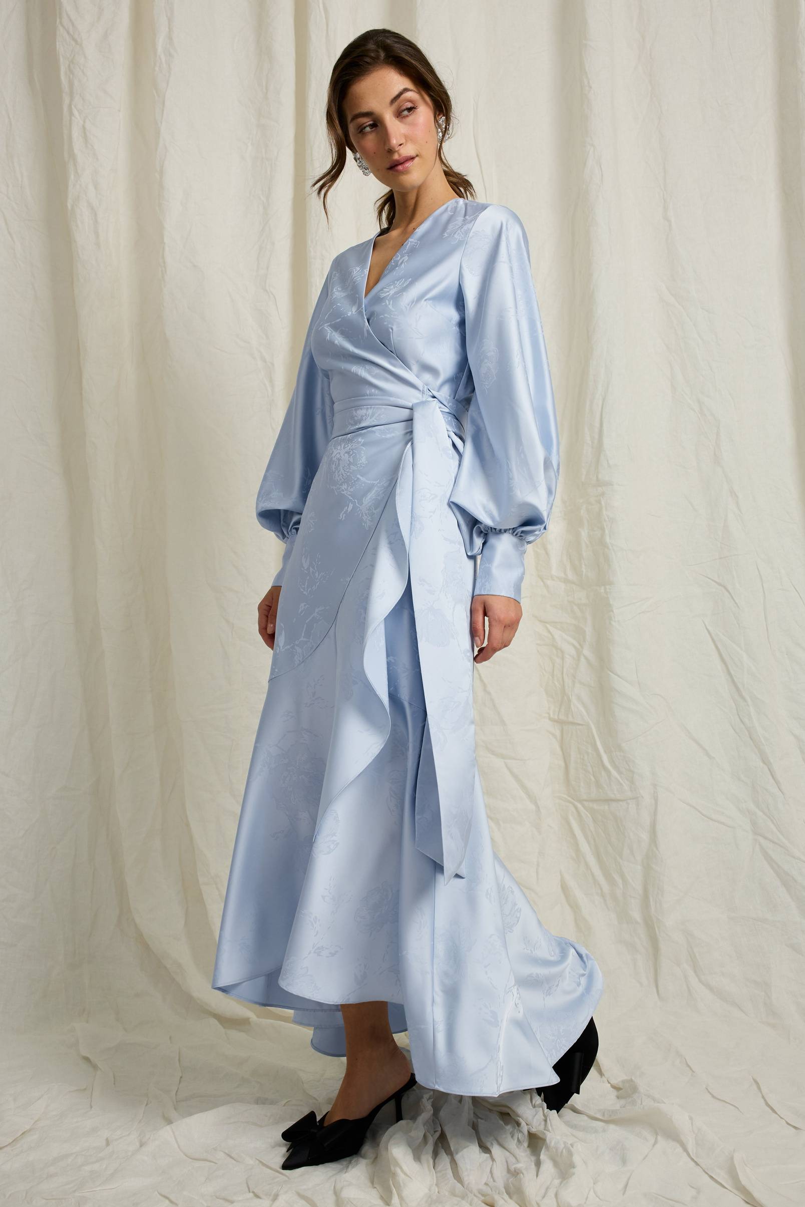 • Lång omlottklänning i satin • Brett knytband i sidan • Voluminösa ballongärmar med manschett • Utsvängd, asymmetrisk nederdel • Längd: 148 cm i storlek 36
