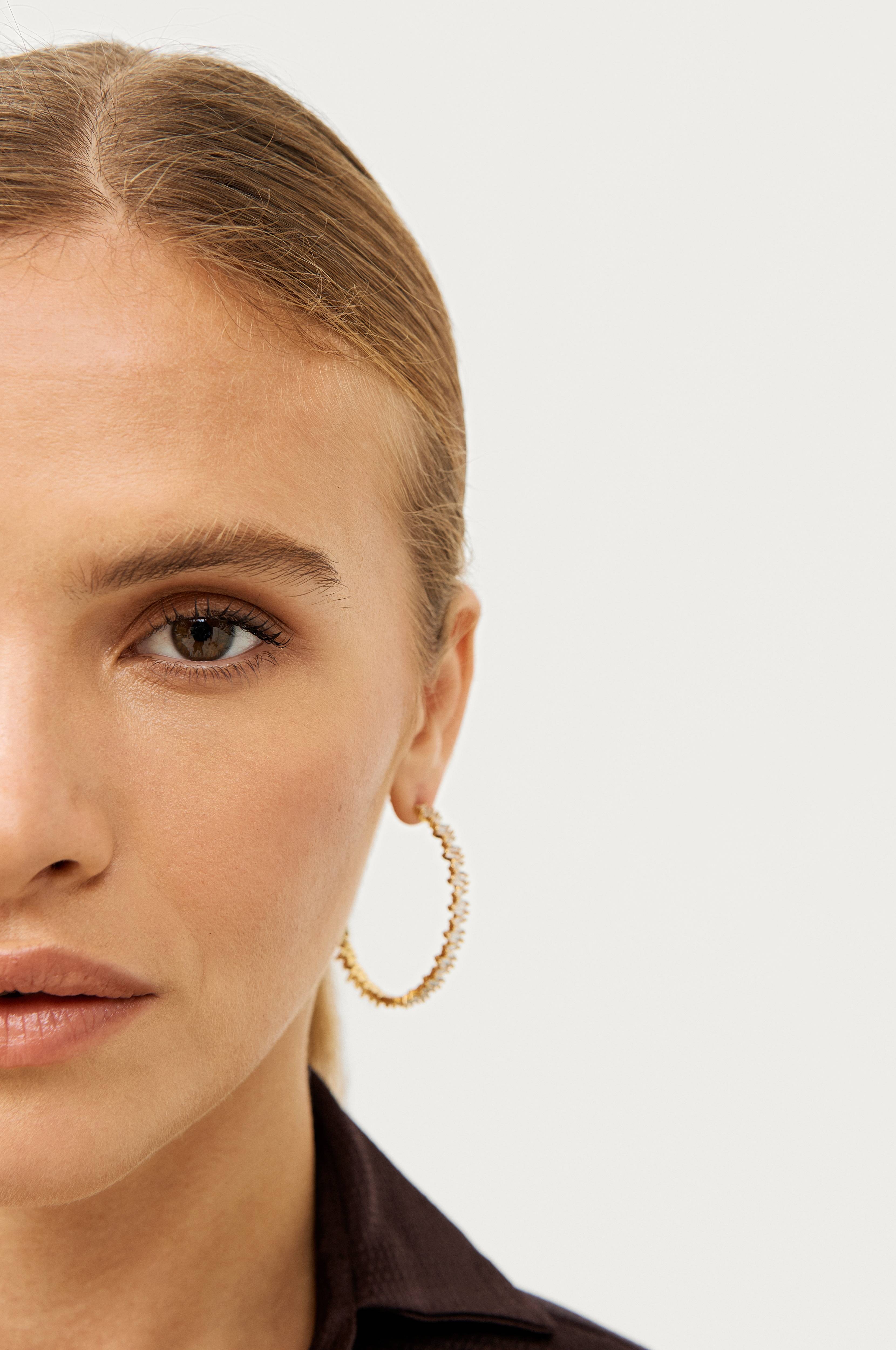 Runda örhängen av 65% mässing och 35% kubisk zirkonia med 18K guldplätering. Diameter 5 cm.