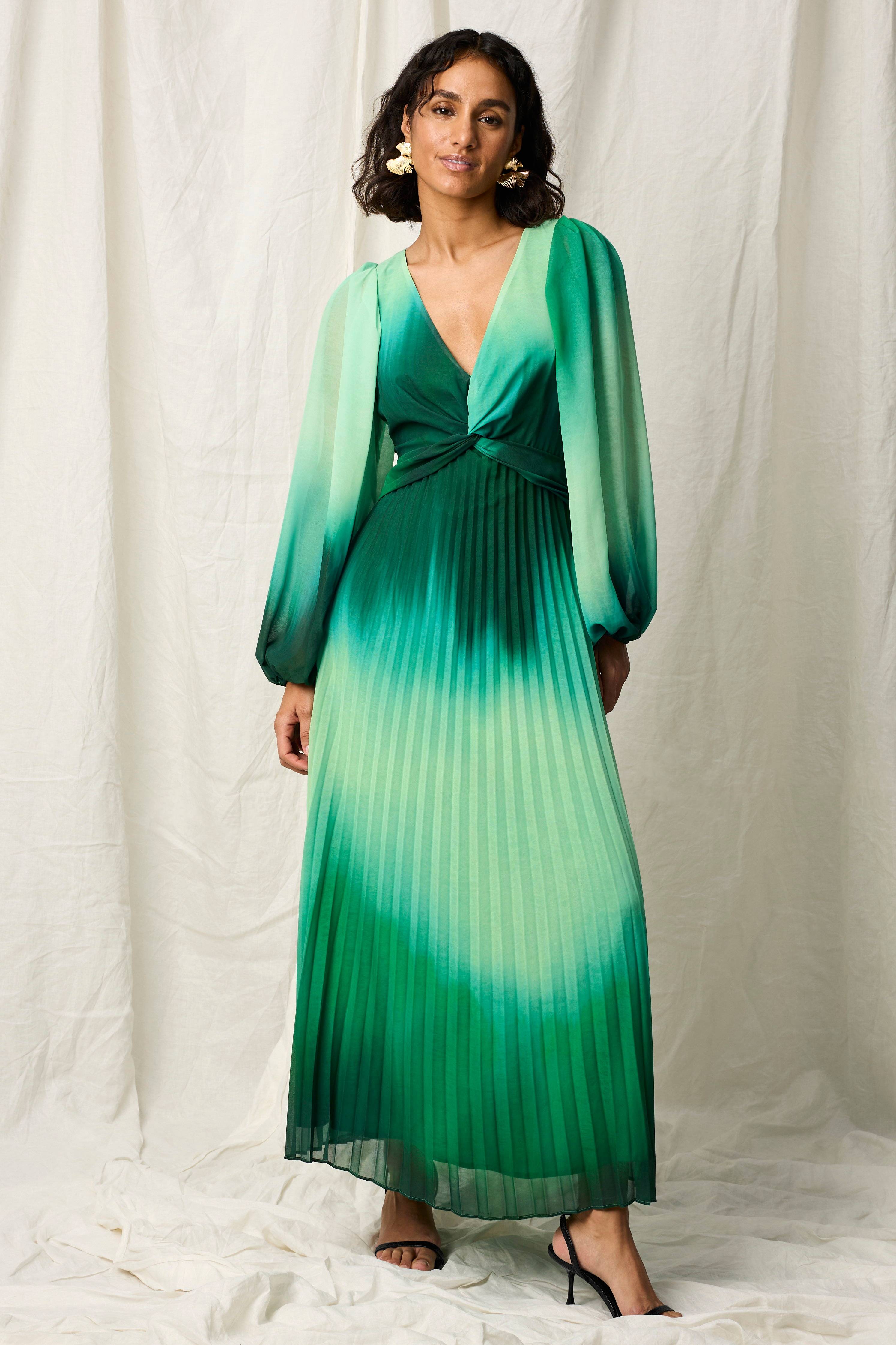 • Lång, plisserad maxiklänning i chiffong• V-ringning fram och bak• Knutdrapering fram• Knytband i nacken• Transparenta ballongärmar med elastiska ärmslut• Tunt foder• Längd: 138 cm i storlek 34/36