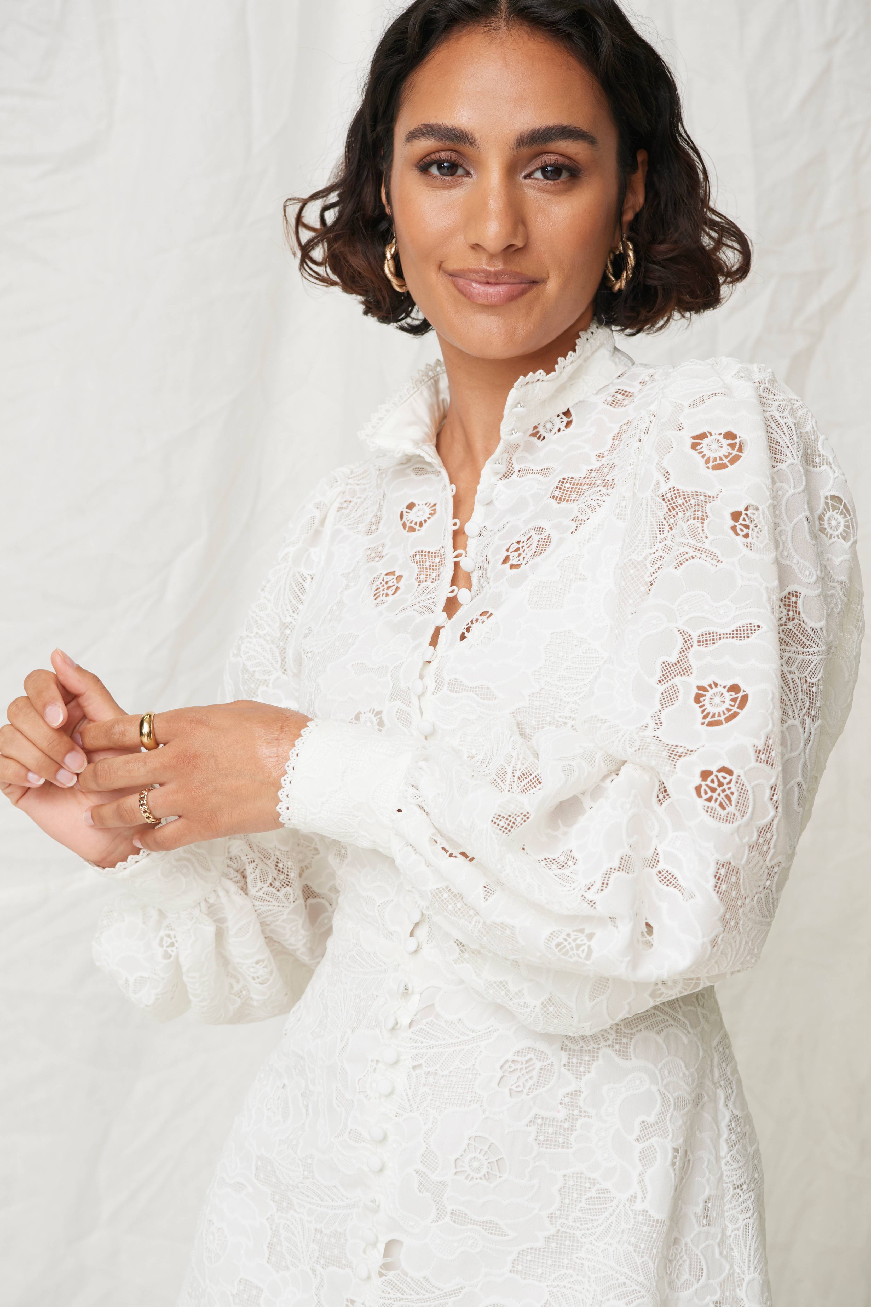• Vadlång, romantisk modell i vävd spets • Textilklädda knappar fram • Voluminösa ballongärmar med manschett • Ståkrage med spetskant • Underklänning i tunt vävt tyg • Dold dragkedja i sidan • Längd: 125 cm i storlek 36