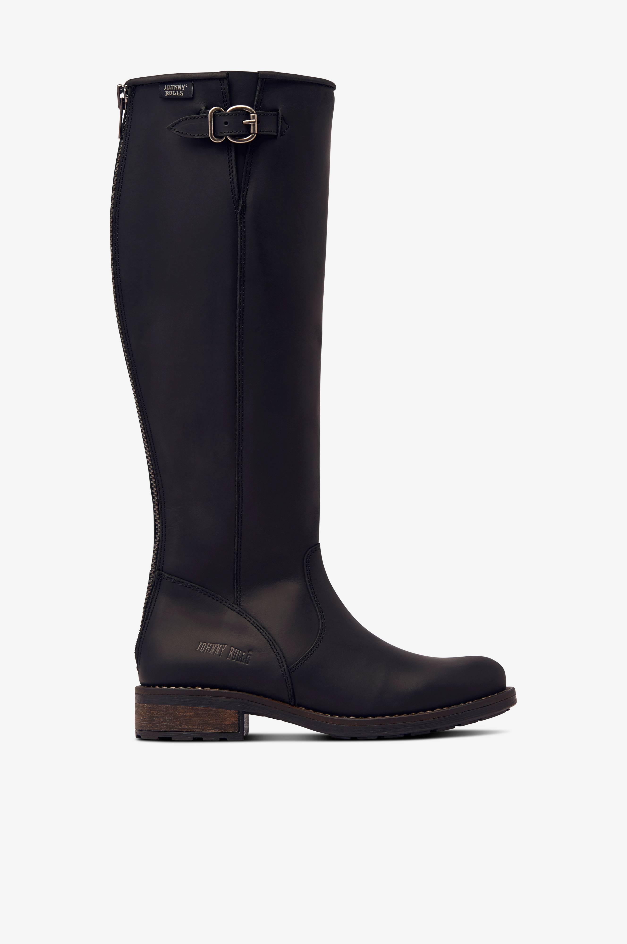 Stövlar High Boot från Johnny Bulls. Rejäl modell i matt, snyggt skinn. Guldfärgad, öppningsbar metalldragkedja mitt bak längs skaftet. Dekorrem med guldfärgat metallspänne över öppningen med kil på skaftets utsida, så skaftvidden kan regleras något. Dold resårkil på skaftets insida. Rundad tå. Klack i träimitation. Skafthöjd ca 42 cm. Klackhöjd ca 3,5 cm.