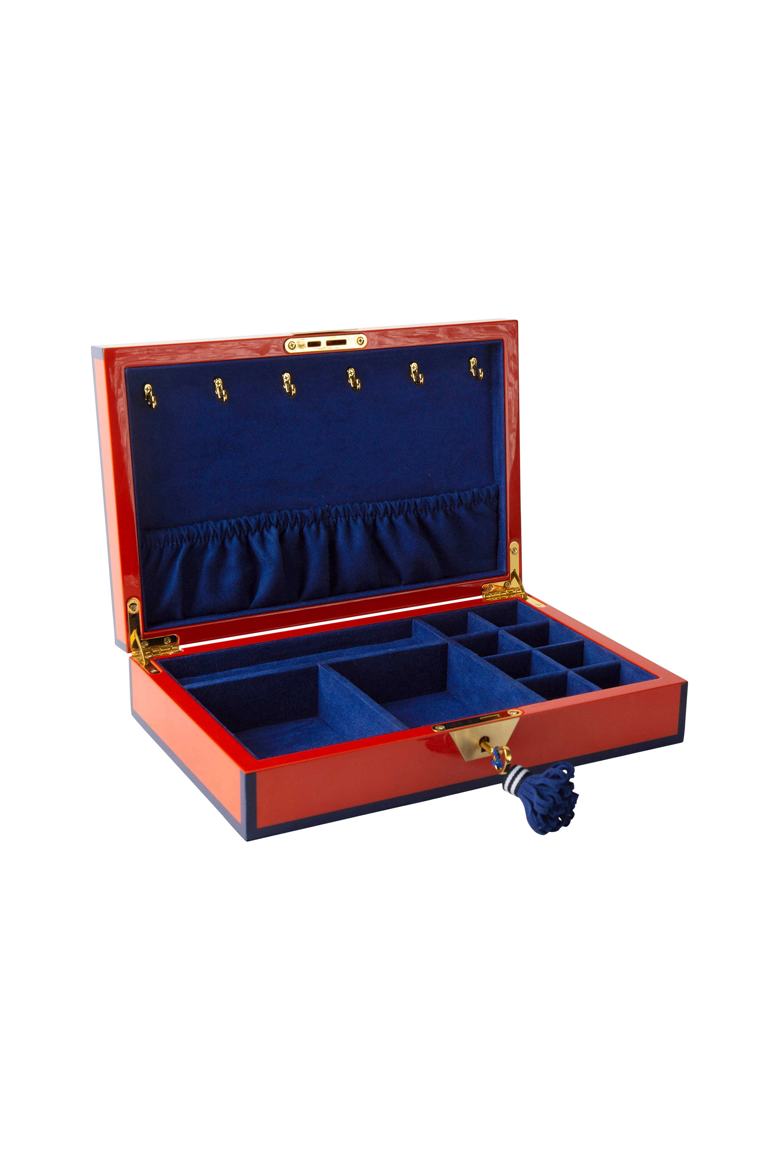 Ge dina smycken en elegant viloplats med vårt handmålade, högblanka smyckeskrin i serien Eden. Utsidan har ett intrikat mönster med två slingrande ormar på en högblank orange bakgrund och insidan är fodrad med lyxig, marinblå sammet. Lås med nyckel och vår signatur: den sexkantiga mässingspläterade plattan. 28,5 cm x 18,5 cm, höjd 6,3 cm.